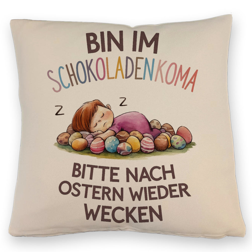 • Das Schokoladenkoma-Kissen bringt Spaß und Farbe ins Kinderzimmer! Auf einem weißen Hintergrund schlummert ein Cartoon-Kind in einem Meer aus bunten Schokoladeneiern. Die verspielten, pastellfarbenen Buchstaben verkünden humorvoll: "Bin im Schokoladenkoma, bitte nach Ostern wieder wecken." Ein pinkes Outfit und hübsche braune Haare runden das Motiv ab.