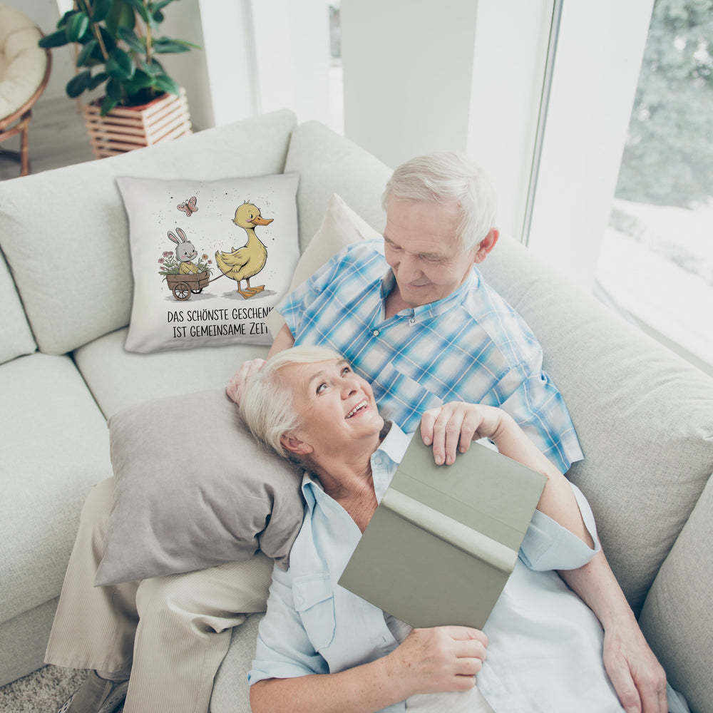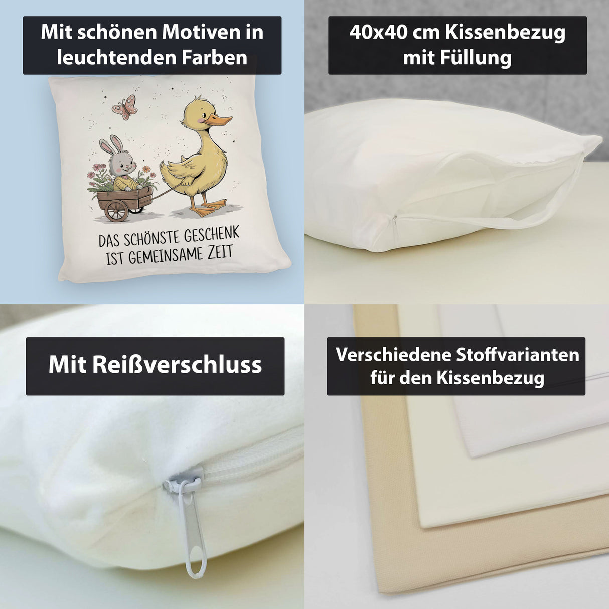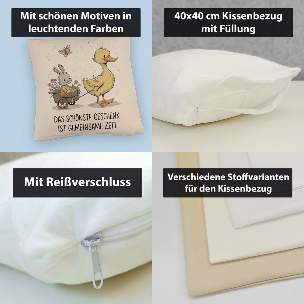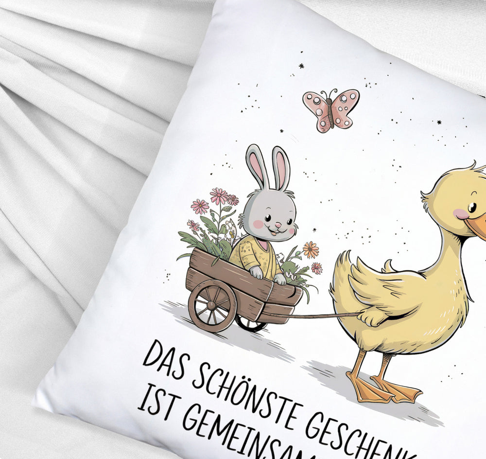 - 1x Schöne gemeinsame Zeit Kissen Ente Kaninchen Blütenwagen in der gewählten Ausführung