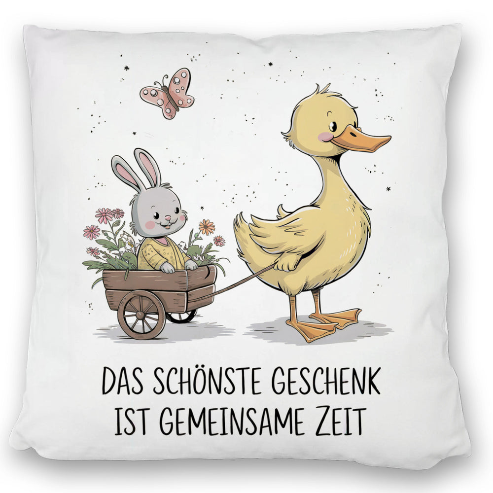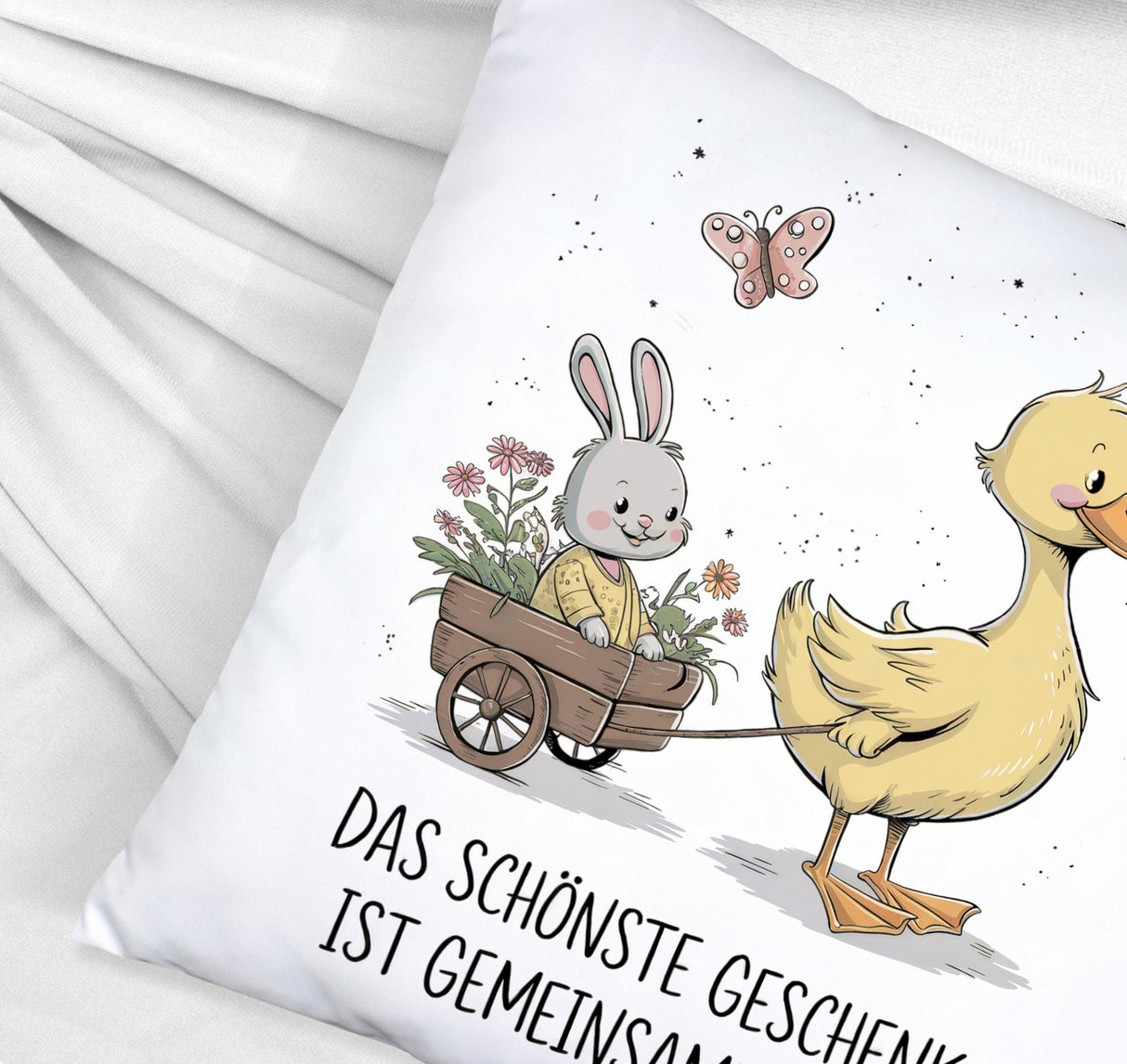 Schöne gemeinsame Zeit Kissen Ente Kaninchen Blütenwagen