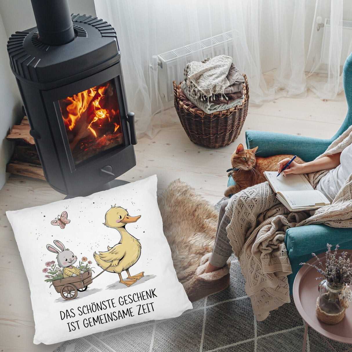 - Dieses fröhliche Dekokissen zeigt eine große gelbe Ente und ein kleines Kaninchen in einem mit Blumen gefüllten hölzernen Wagen. Die Ente zieht den Wagen, während ein Schmetterling über ihnen schwebt. Der Hintergrund mit kleinen schwarzen Punkten und der Spruch 'DAS SCHÖNSTE GESCHENK IST GEMEINSAME ZEIT' runden das Design ab.