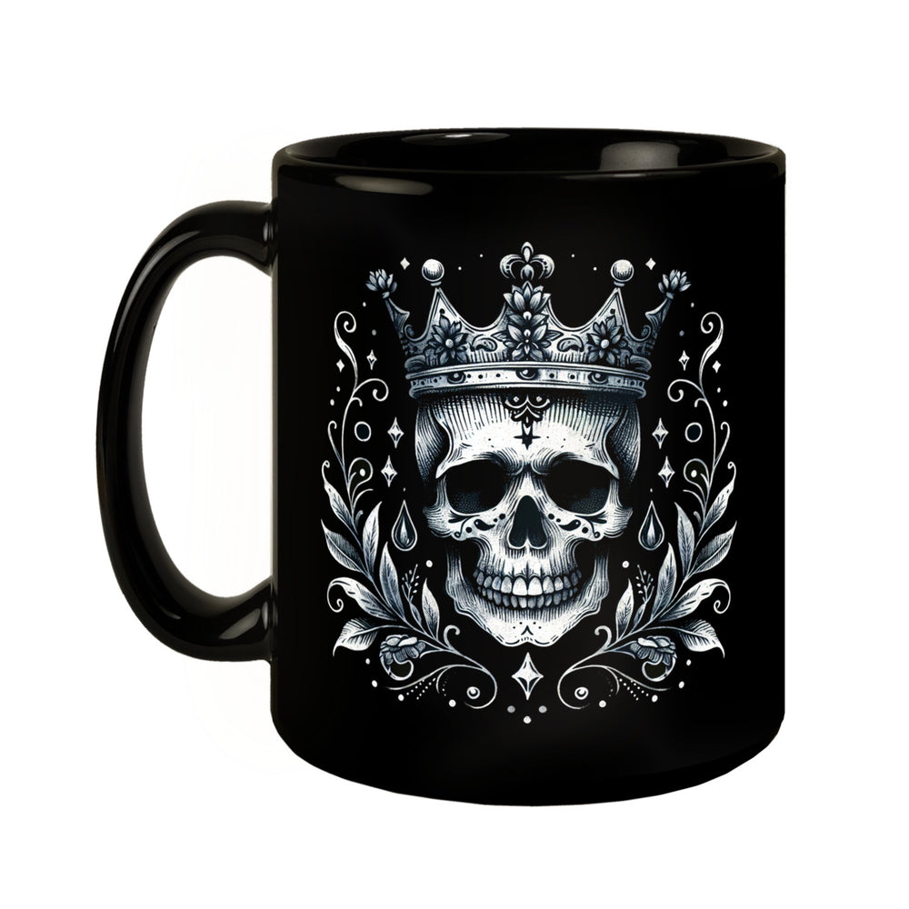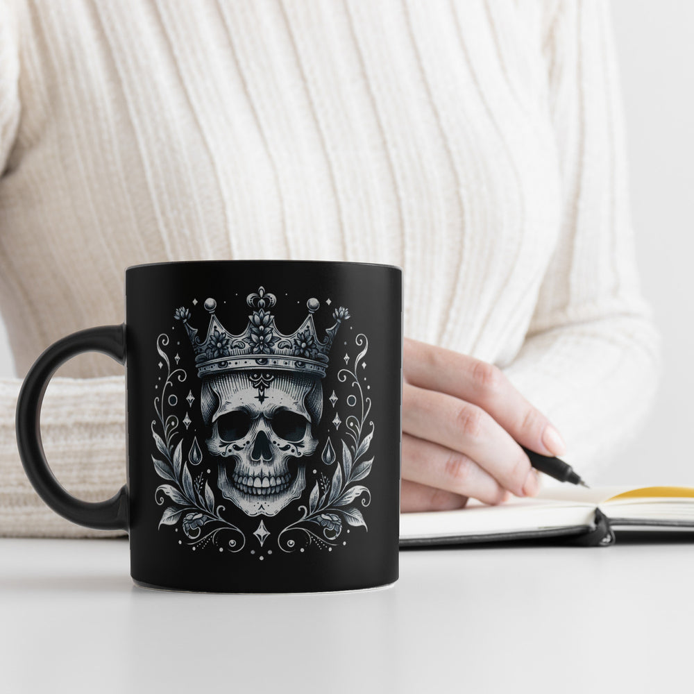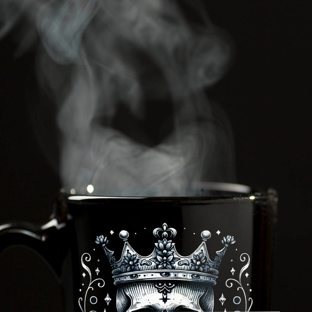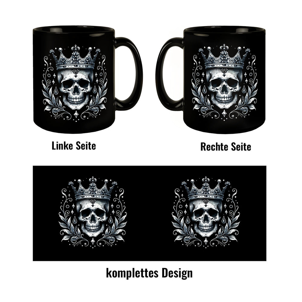 - Werde mit der "Skelettkönig Tasse in Schwarz" zum Monarchen der Morgenmuffel! Dieses edle Gefäß vereint königliches Flair mit einem Hauch von Halloween. Ein nobler Knochen-Kopf, gekrönt wie ein echter Monarch, thront auf deiner neuen Lieblingstasse. Majestätisch, makaber, must-have!