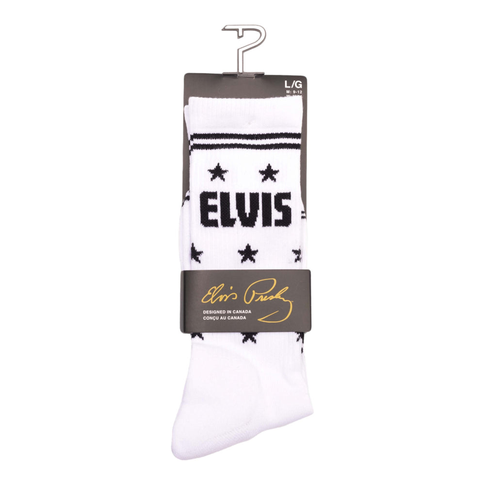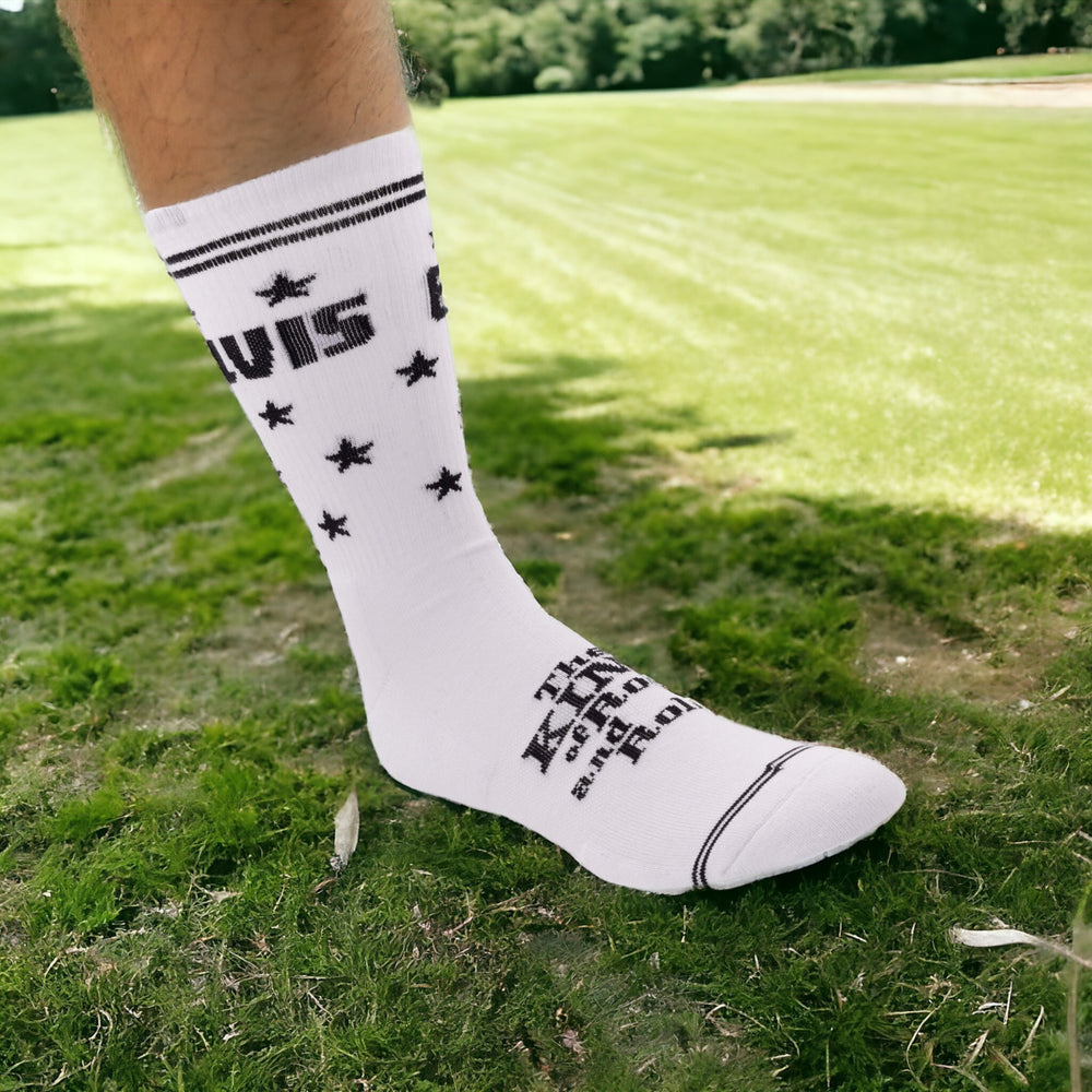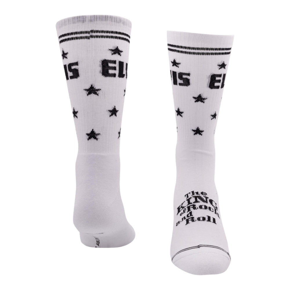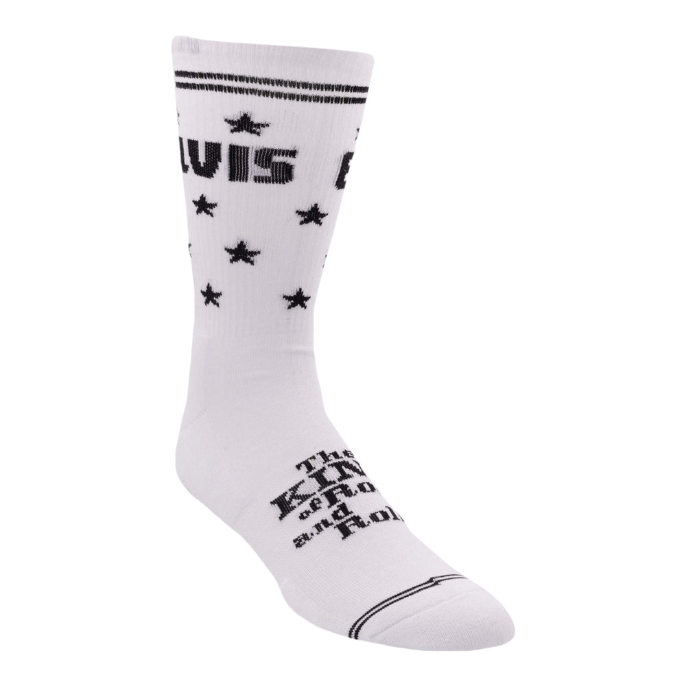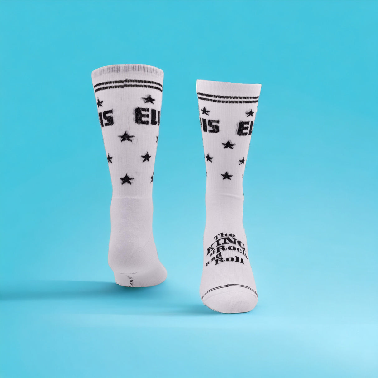 - Schlichtes Weiß trifft auf rockiges Schwarz! Die Socken 'The King' mit ikonischem ELVIS-Schriftzug und himmlischen Sternen machen deine Füße zur Bühne für den größten Musiker aller Zeiten. Ideal, um deinen Look mit einer Prise Rock 'n' Roll zu würzen!