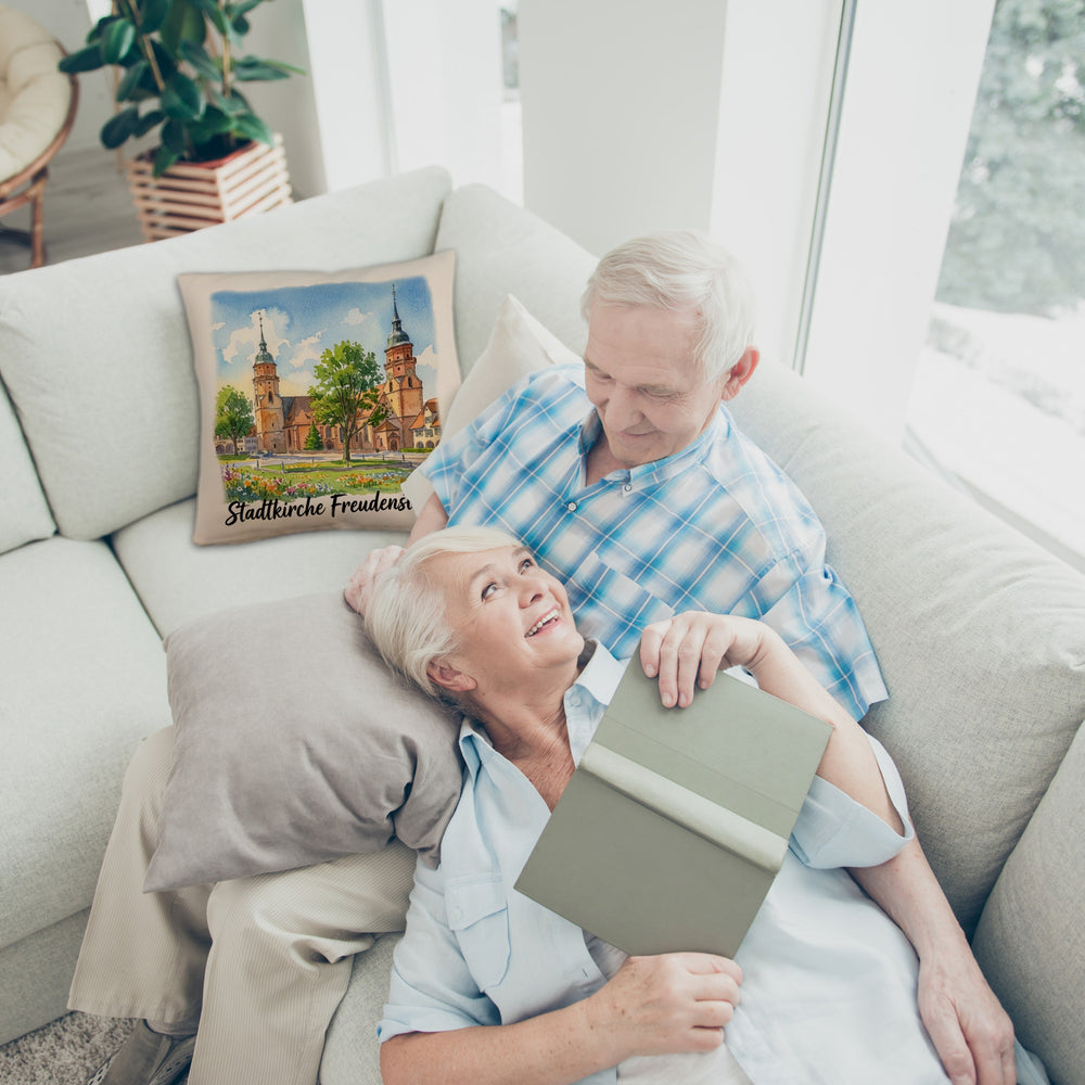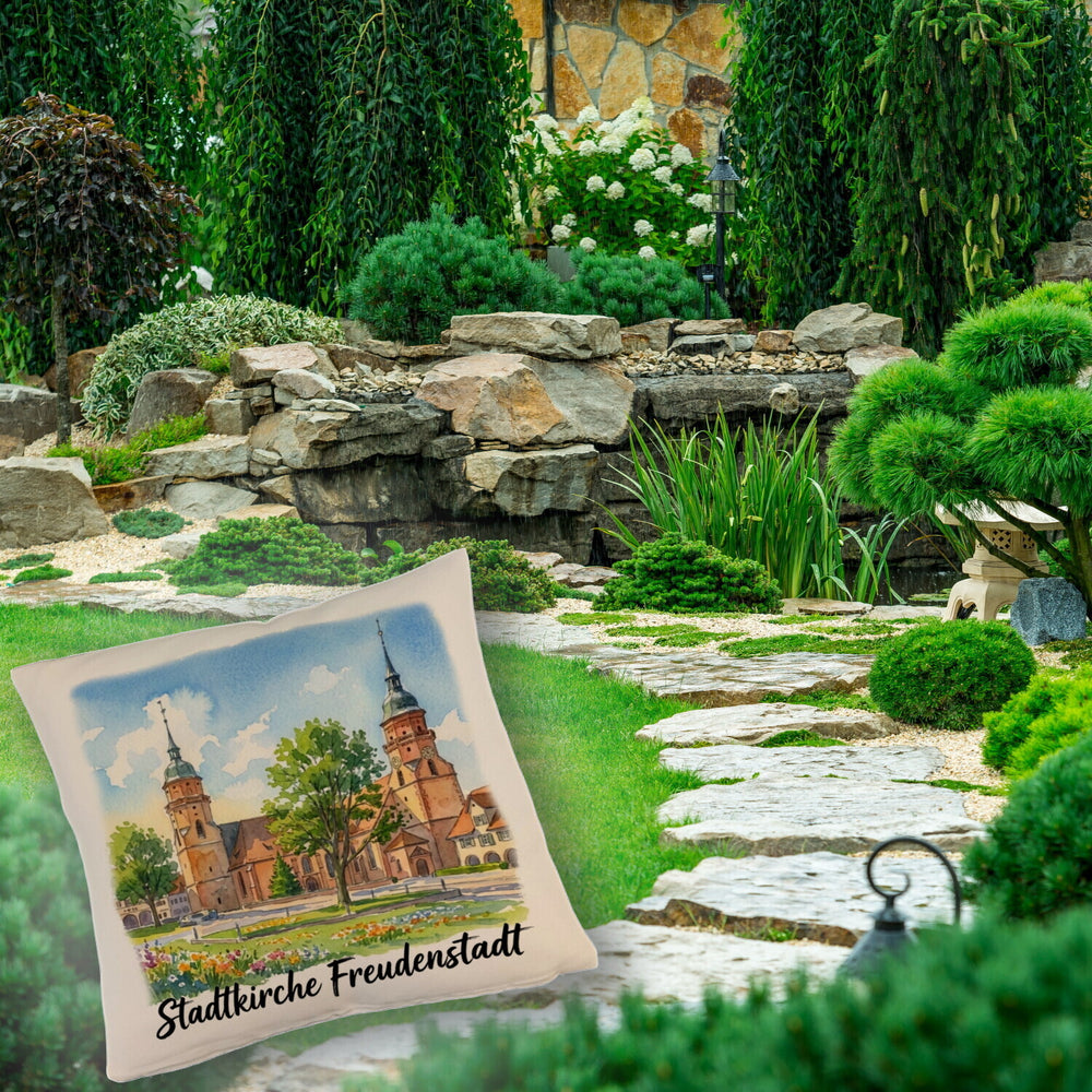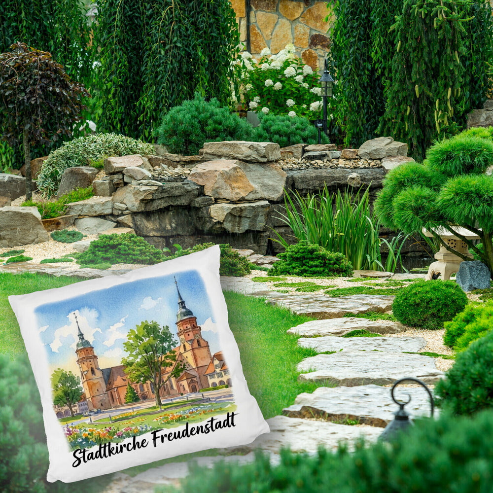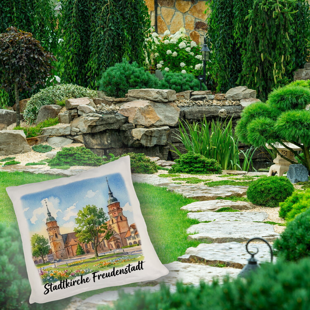 - Das Stadtkirche Freudenstadt Kissen zeigt ein bezauberndes Aquarellmotiv der ikonischen Kirchenarchitektur mit spitzen Türmen und lebendigem Blumengarten. Ein hellblauer Rand verleiht dem Bild eine postkartenähnliche Erscheinung. Dieses stilvolle Kissen bringt Farbe und Charakter auf jede Couch und zieht alle Blicke auf sich!