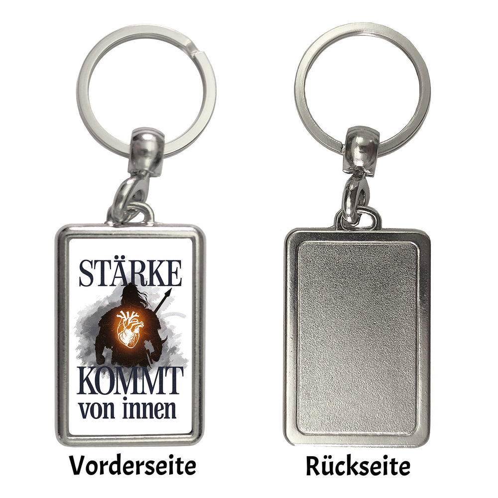 - Der Schlüsselanhänger zeigt die Silhouette eines Kriegers, vielleicht ein Ritter oder Wikinger, auf dramatischem Hintergrund. In seinen Händen eine Waffe, während eine leuchtende Rune über dem Herzbereich innere Stärke symbolisiert. Das Design zaubert intensive Stimmung mit dunklen Wolken und rauchiger Atmosphäre, verstärkt durch den starken Spruch: "Stärke kommt von innen".