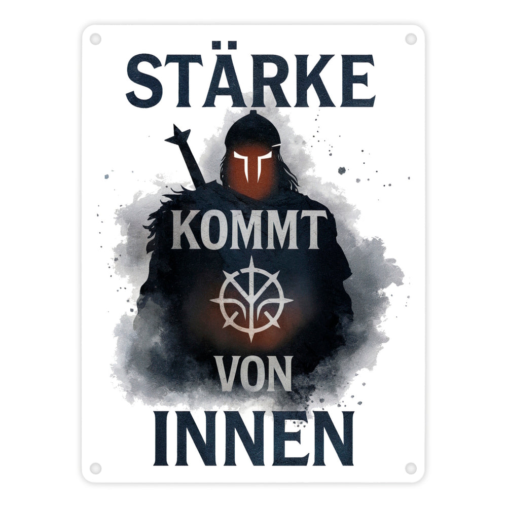 - Dieses Metallschild beeindruckt mit der Silhouette eines Kriegers, vielleicht ein furchtloser Ritter, der einen Helm mit leuchtend rotem Visier trägt. Der inspirierende Spruch "Stärke kommt von innen" prangt in fetten Buchstaben vor einem zauberhaften, pastellfarbenen Aquarellhintergrund. Eine leuchtende Rune über dem Herzen des Kriegers symbolisiert innere Kraft.
