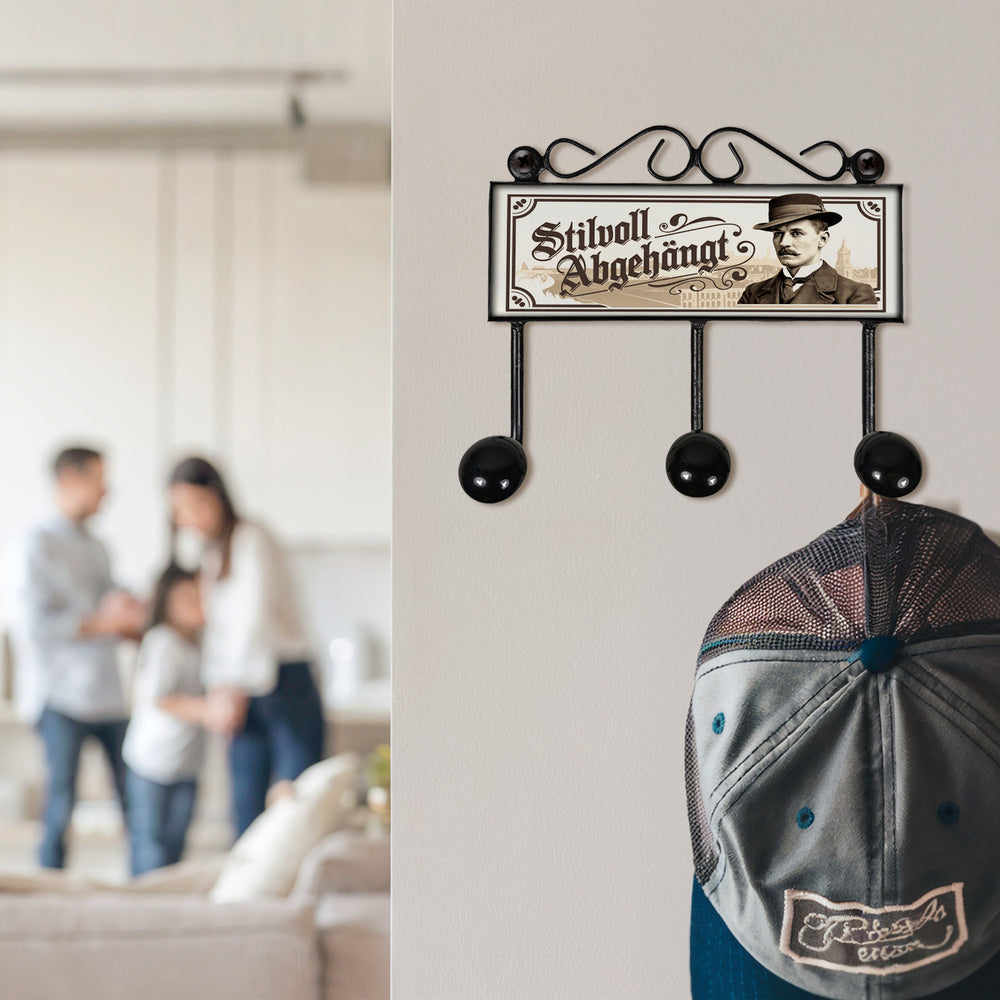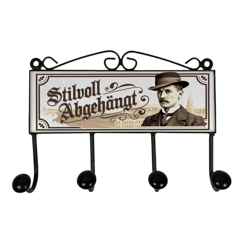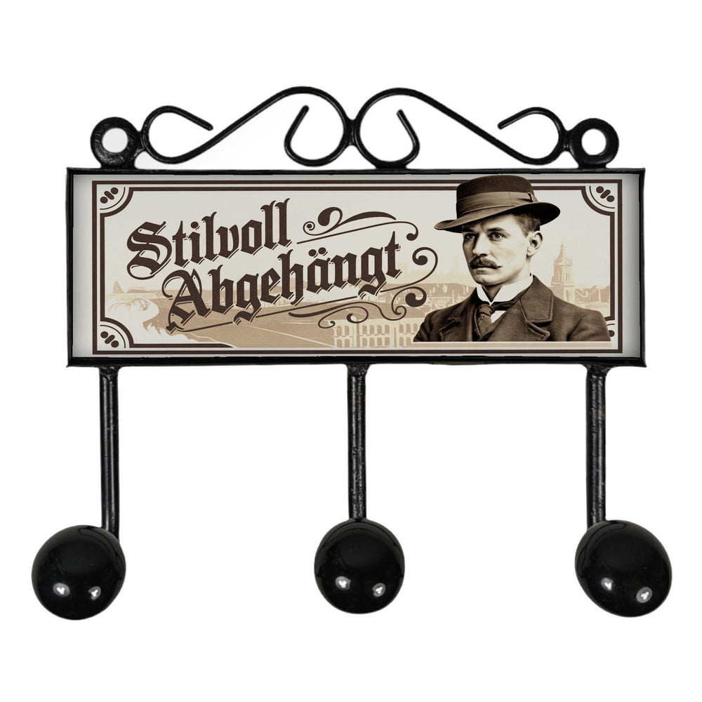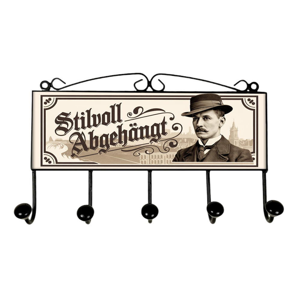 - Diese stylische Kleiderhakenleiste zeigt einen schicken Mann mit Schnurrbart, altmodischem Hut und Anzug vor einer städtischen Kulisse. Das Design in Sepia-Tönen verleiht Ihrem Zuhause nostalgischen Vintage-Charme. Der lustige Spruch "Stilvoll abgehängt" sorgt für ein Schmunzeln und macht diese Garderobe zu einem echten Hingucker!