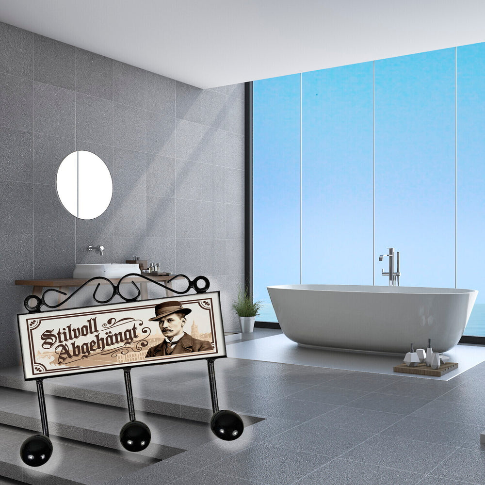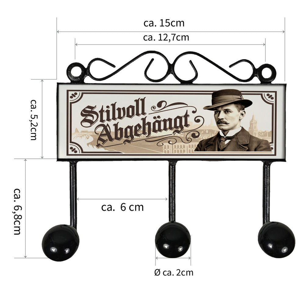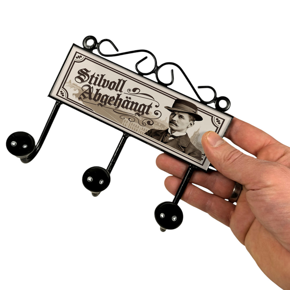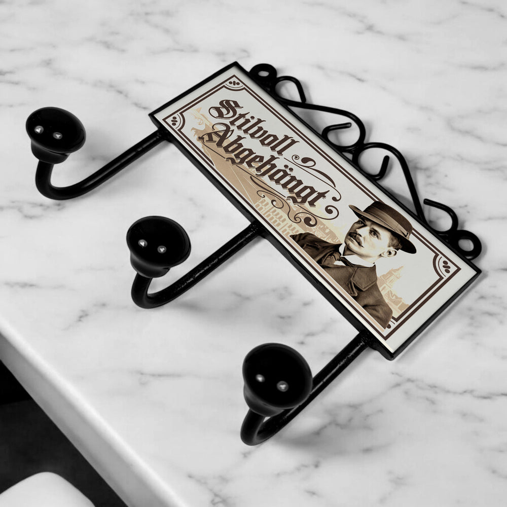 - Diese stylische Kleiderhakenleiste zeigt einen schicken Mann mit Schnurrbart, altmodischem Hut und Anzug vor einer städtischen Kulisse. Das Design in Sepia-Tönen verleiht Ihrem Zuhause nostalgischen Vintage-Charme. Der lustige Spruch "Stilvoll abgehängt" sorgt für ein Schmunzeln und macht diese Garderobe zu einem echten Hingucker!