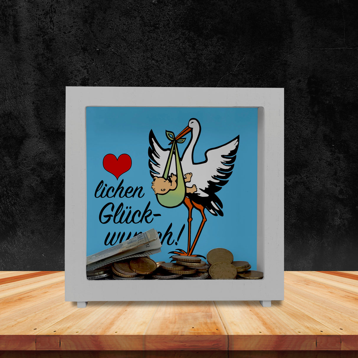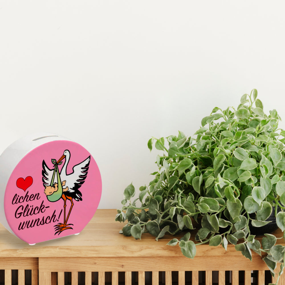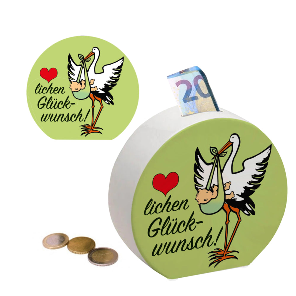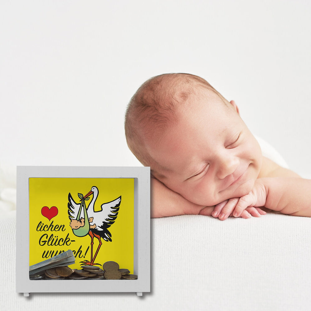 - 1x Storch und Kind Spardose zur Geburt mit niedlichem Motiv in der gewählten Ausführung
