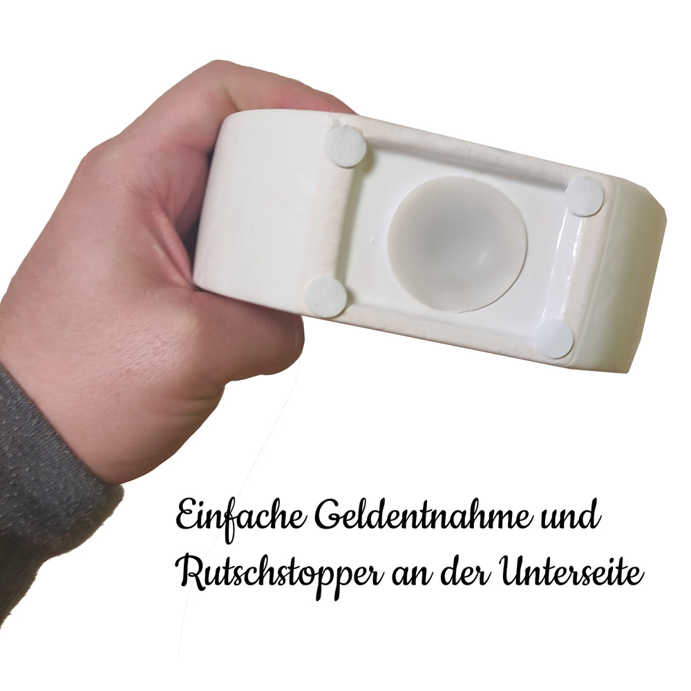 - Die Geldentnahme gestaltet sich dank des Stopfens auf der Unterseite der Spardose erstaunlich einfach.