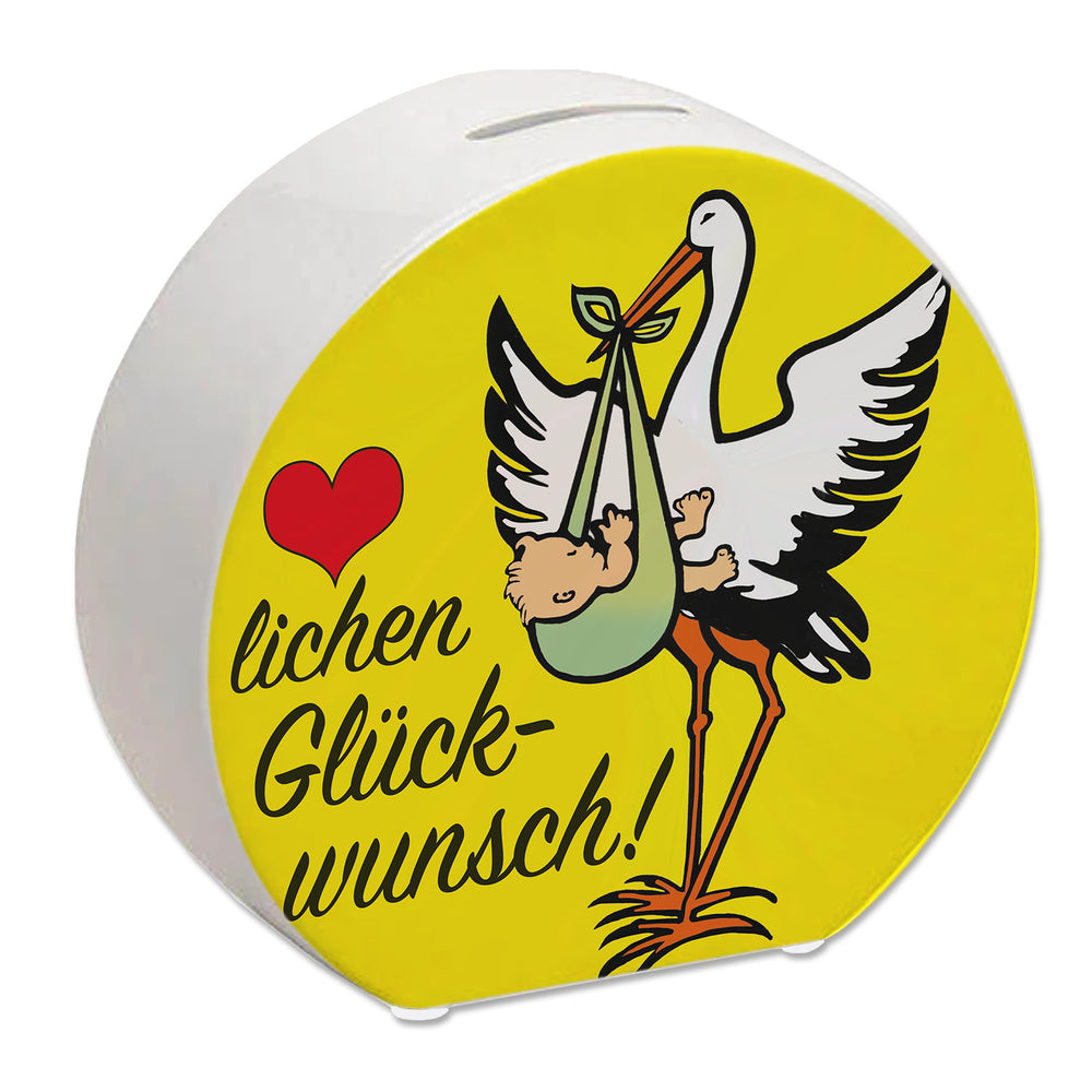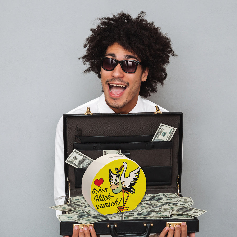 Storch und Kind Spardose zur Geburt mit niedlichem Motiv