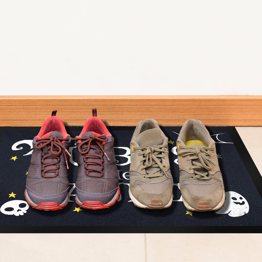 Fußmatte mit kleinem Geist und Boo Schriftzug im schlichten Halloween Stil