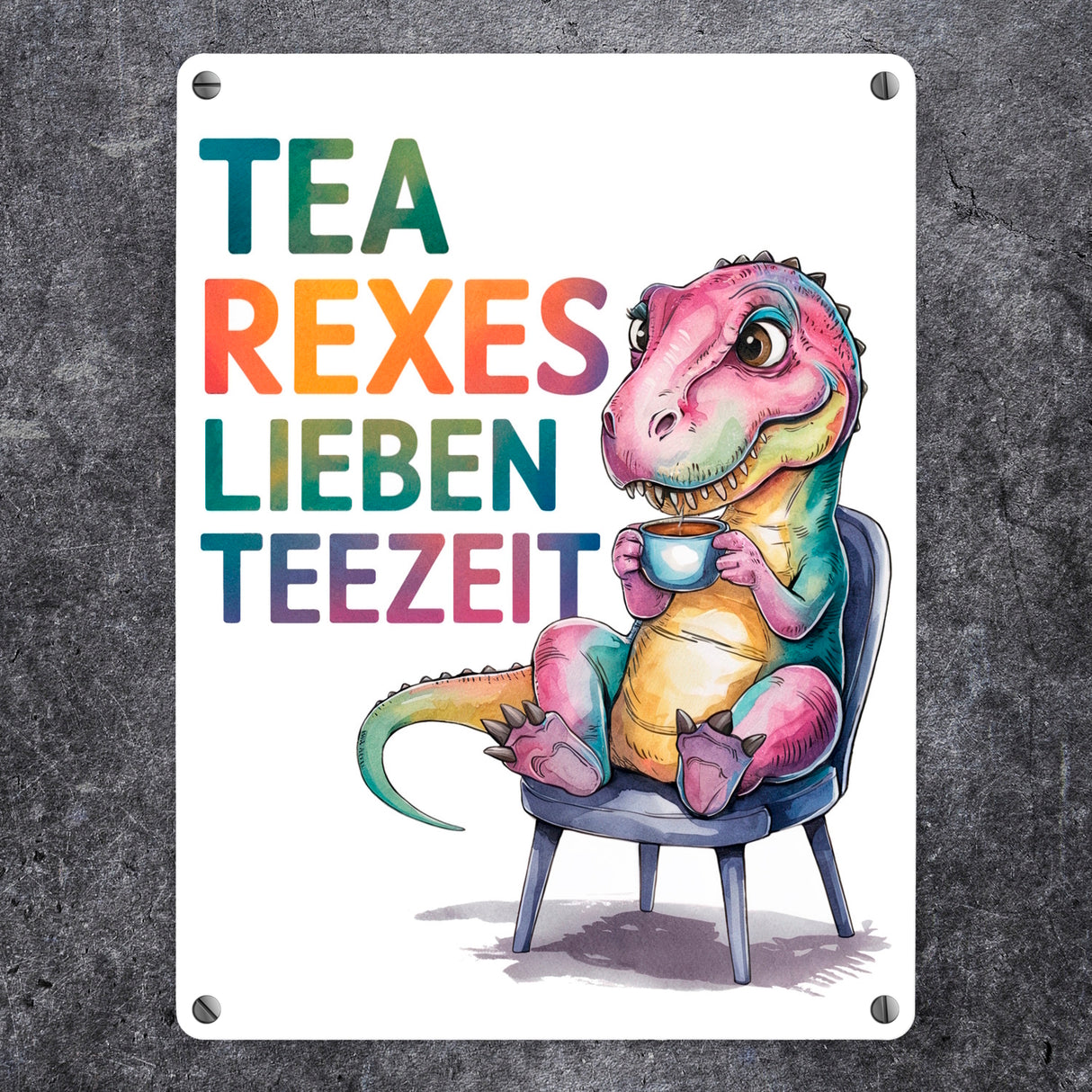 - Dieses charmante Metallschild zeigt einen cartoonartigen T-Rex, der genüsslich eine Tasse Tee schlürft. Die farbenfrohen Buchstaben verkünden: "TEA REXES LIEBEN TEEZEIT". Mit seiner spielerischen Mimik und einer niedlichen Teekanne ist dieses Schild ein echter Hingucker und bringt garantiert Freude.