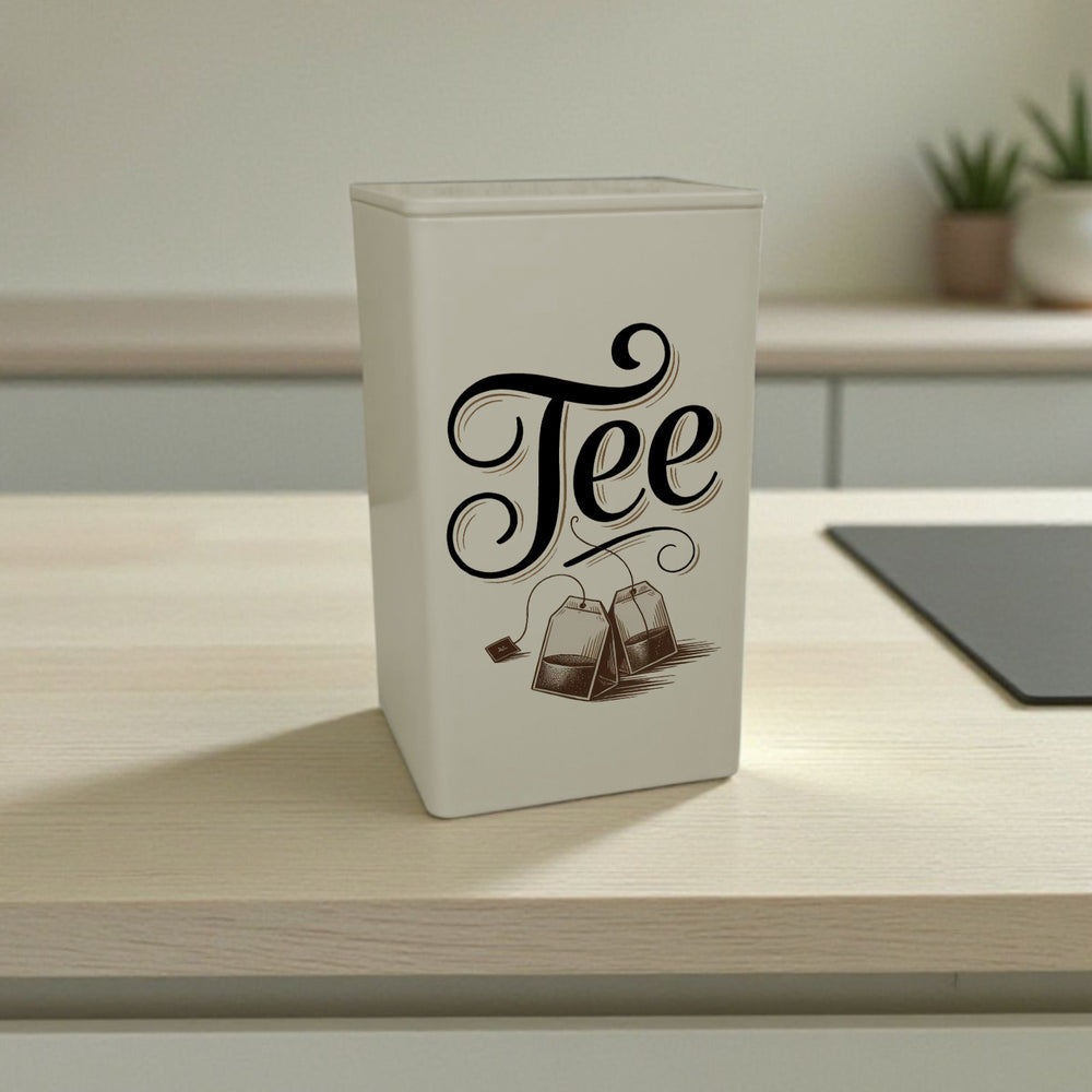- Diese Vintage-Vorratsdose präsentiert das Wort "Tee" in eleganter Kalligrafie, umgeben von kunstvollen Schnörkeln. Zwei zarte Teebeutel hängen anmutig daneben. In warmen Sepia- und Goldbrauntönen gestaltet, strahlt die Dose nostalgischen Charme aus. Perfekt für alle, die Stil und Funktionalität schätzen!