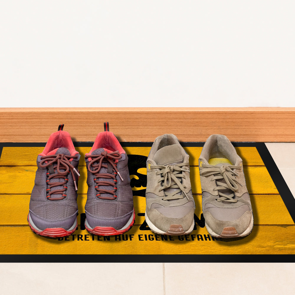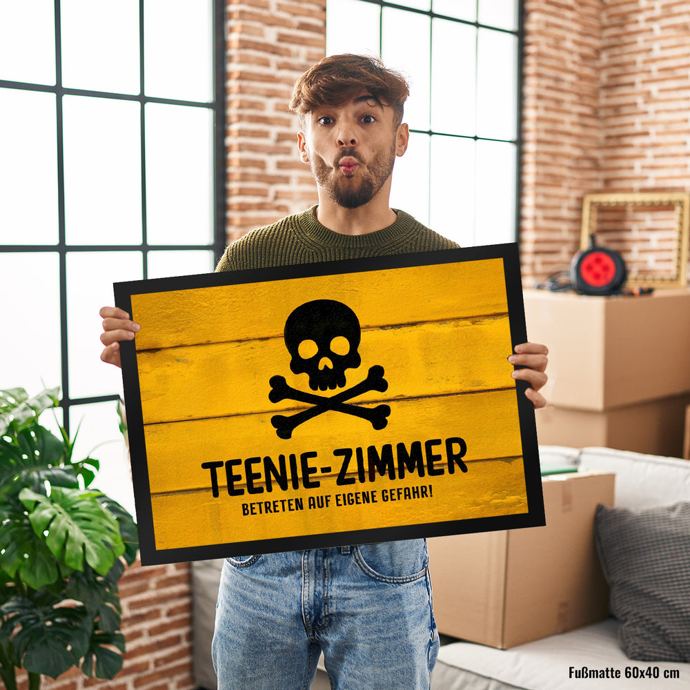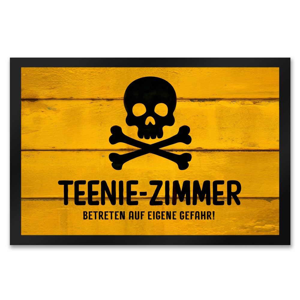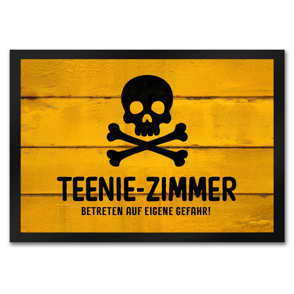 - Diese auffällige Fußmatte mit einem Totenkopf- und Knochen-Design hat einen leuchtend gelben Hintergrund. In verspielter schwarzer Schrift steht 'Teenie-Zimmer', gefolgt von der witzigen Warnung 'Betreten auf eigene Gefahr!'. Ein humorvolles Accessoire, das garantiert Blicke auf sich zieht!