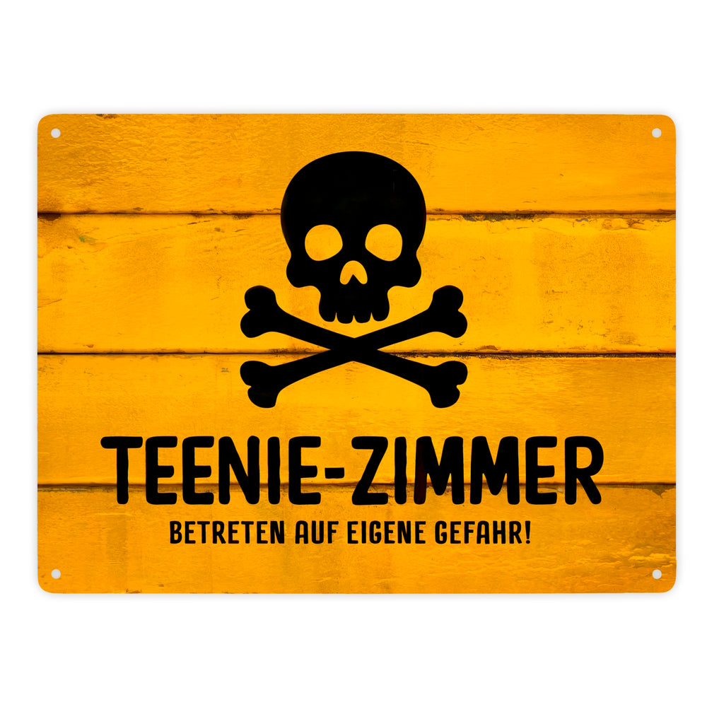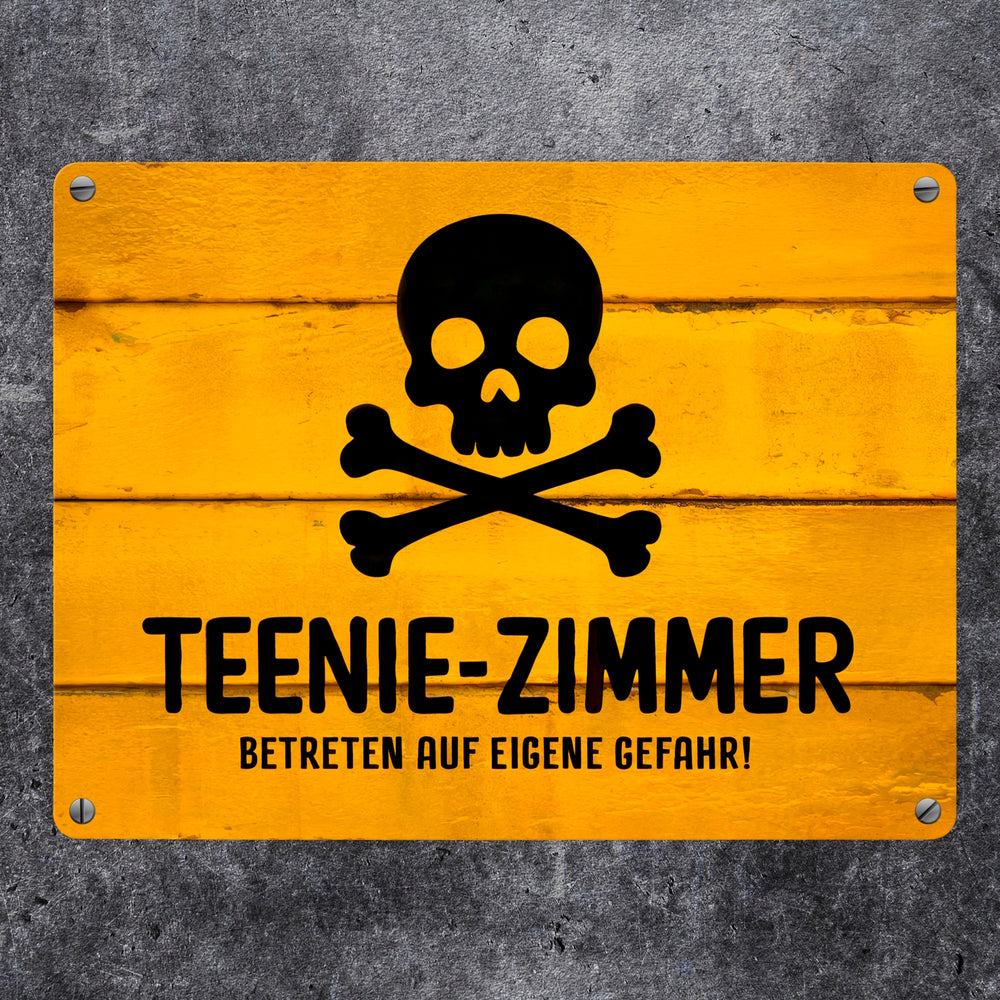 - Dieses auffällige Metallschild besticht durch seinen leuchtend gelben Hintergrund und das ikonische schwarze Totenkopf- und Knochen-Symbol. Mit dem verspielten Spruch "Teenie-Zimmer Betreten auf eigene Gefahr!" ist es ein echter Hingucker. Ein cooles Element für jedes Jugendzimmer, das Humor und Abenteuerlust versprüht!