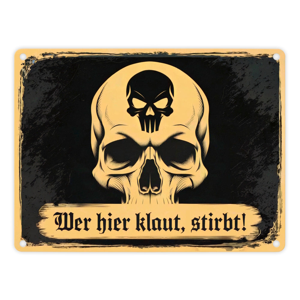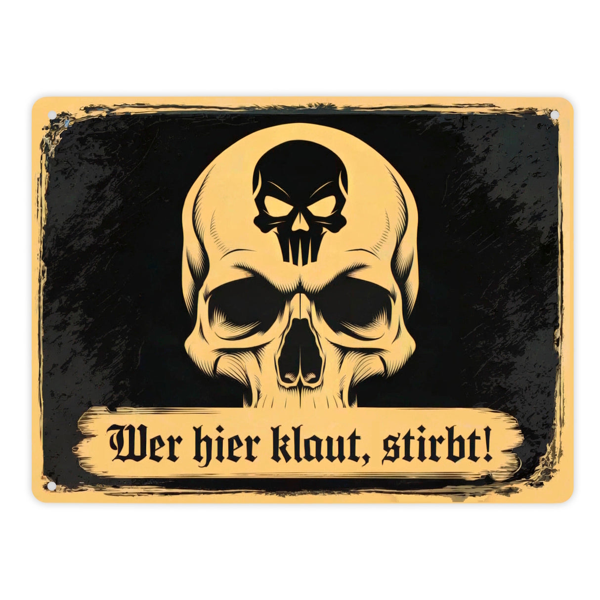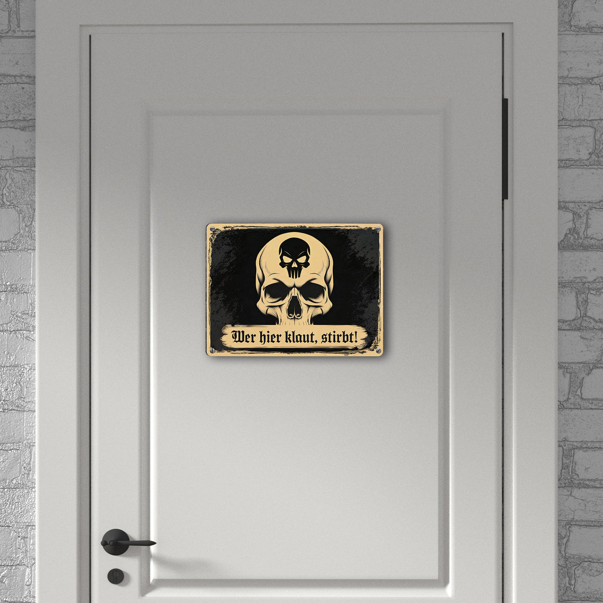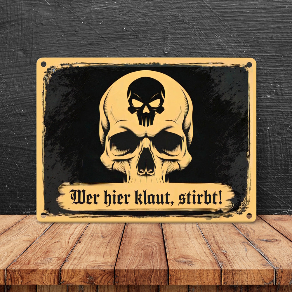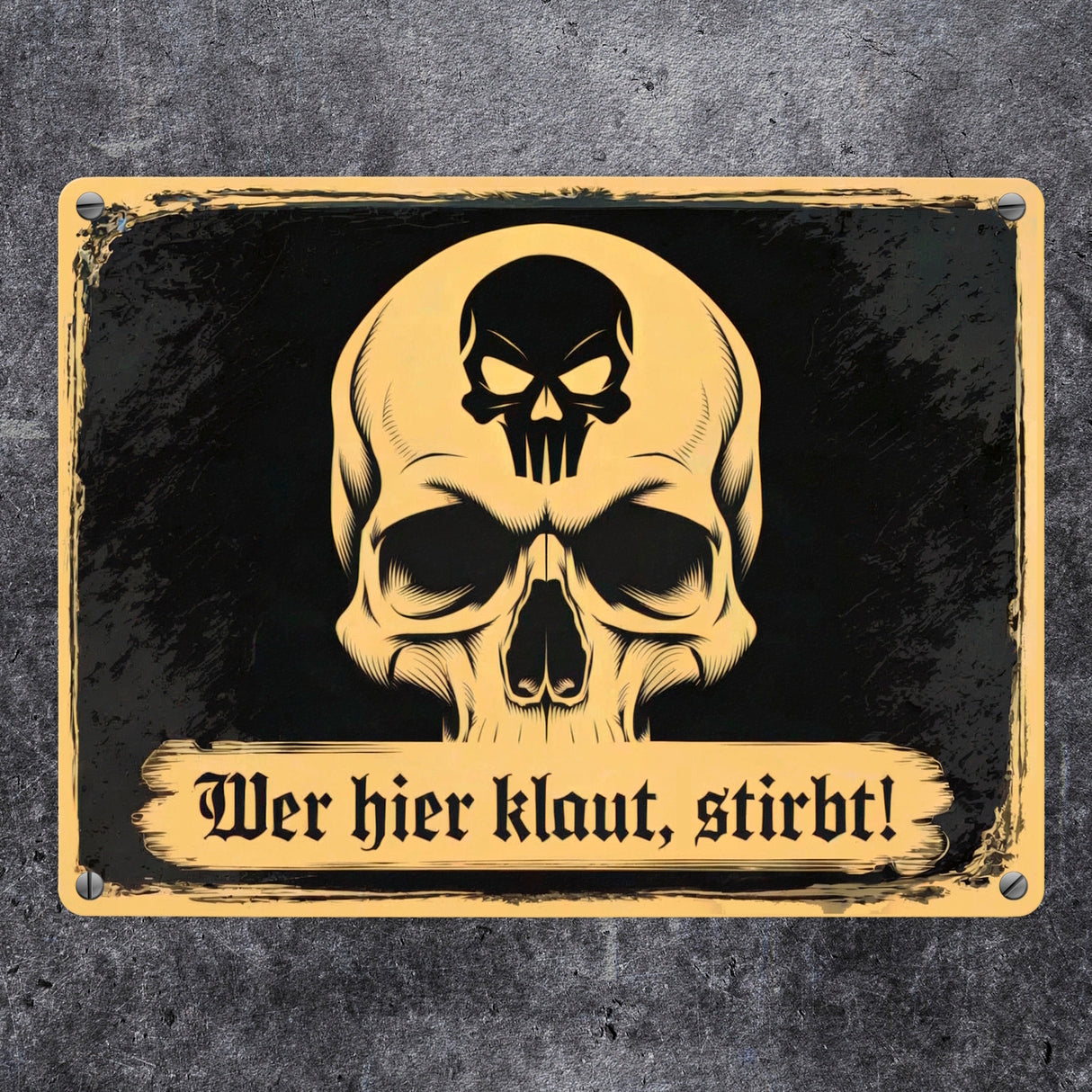 Totenkopf Warnung Wer hier klaut STIRBT Metallschild in 15x20 cm