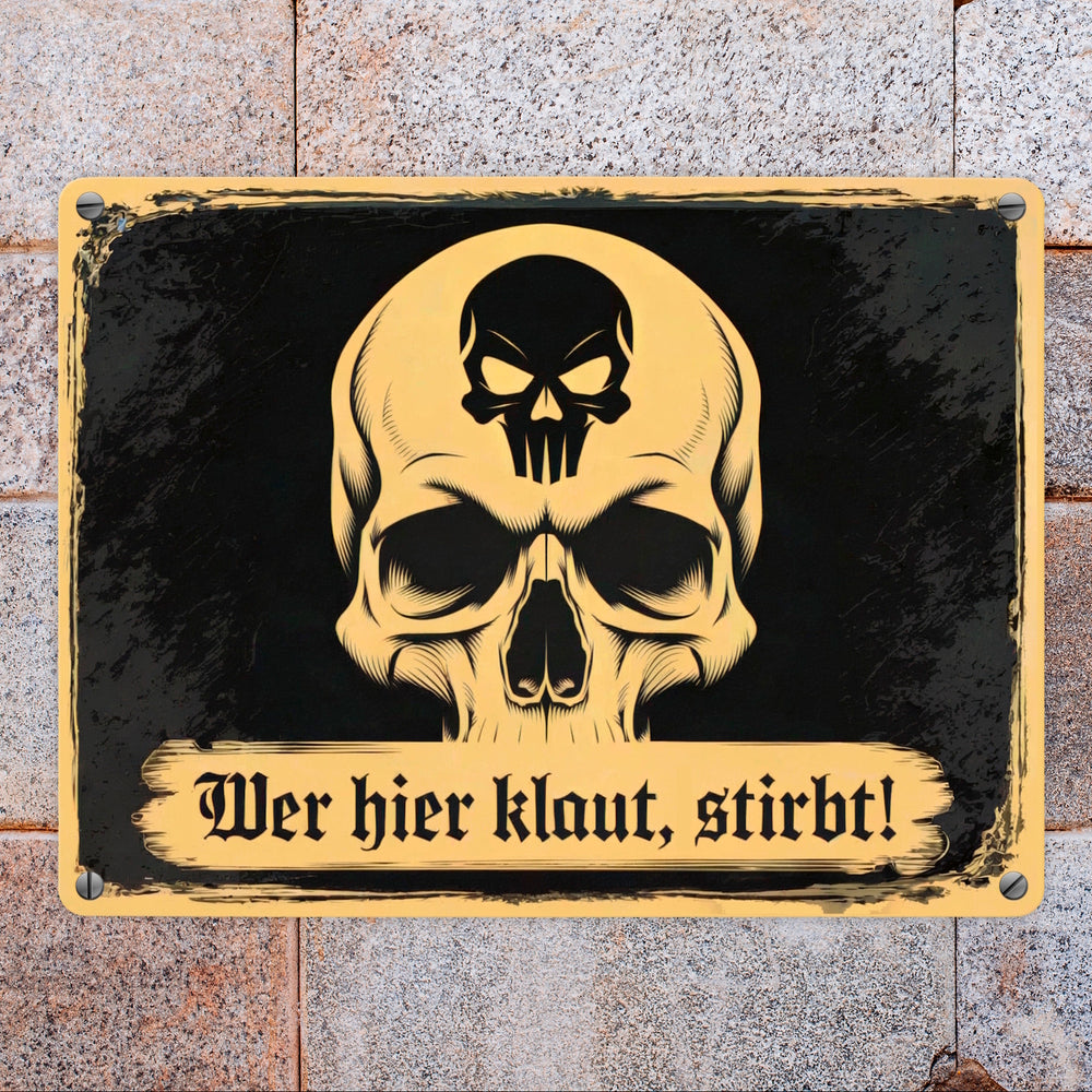 - Aufgepasst, hier kommt das ultimative Warnschild! In erfrischendem Vintage-Stil präsentiert dieses Metallschild ein drohendes Totenkopf-Design. Mit schwarzem Hintergrund und gelbem Rand zieht es garantiert alle Blicke auf sich. Die Botschaft ist klar: "Wer hier klaut, STIRBT!" – der perfekte Schreck für Langfinger!