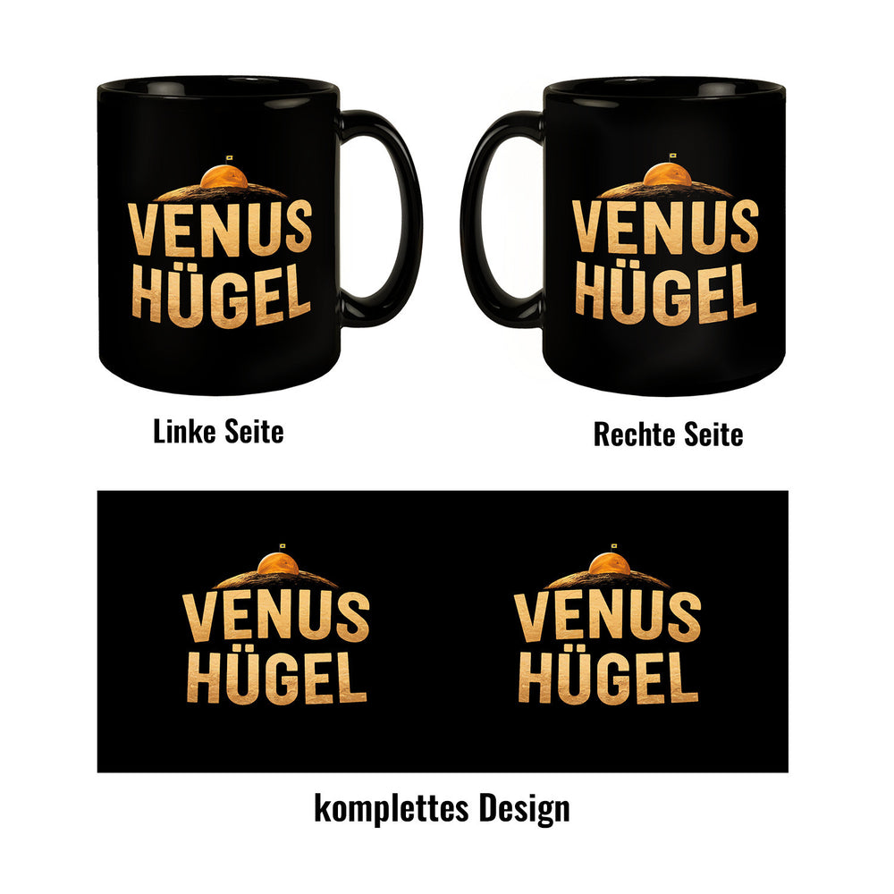 Die Venus Hügel Wortwitz Tasse präsentiert ein humorvolles Design: Ein schwarzer Kaffeebecher mit dem frechen Spruch "Venushügel". Auf dem Becher ist die Venus als Kugel mit Kratern und einer kleinen Fahne auf einem Hügel dargestellt. Ein witziges Hinweise: Fassungsvermögen: ca. 300ml