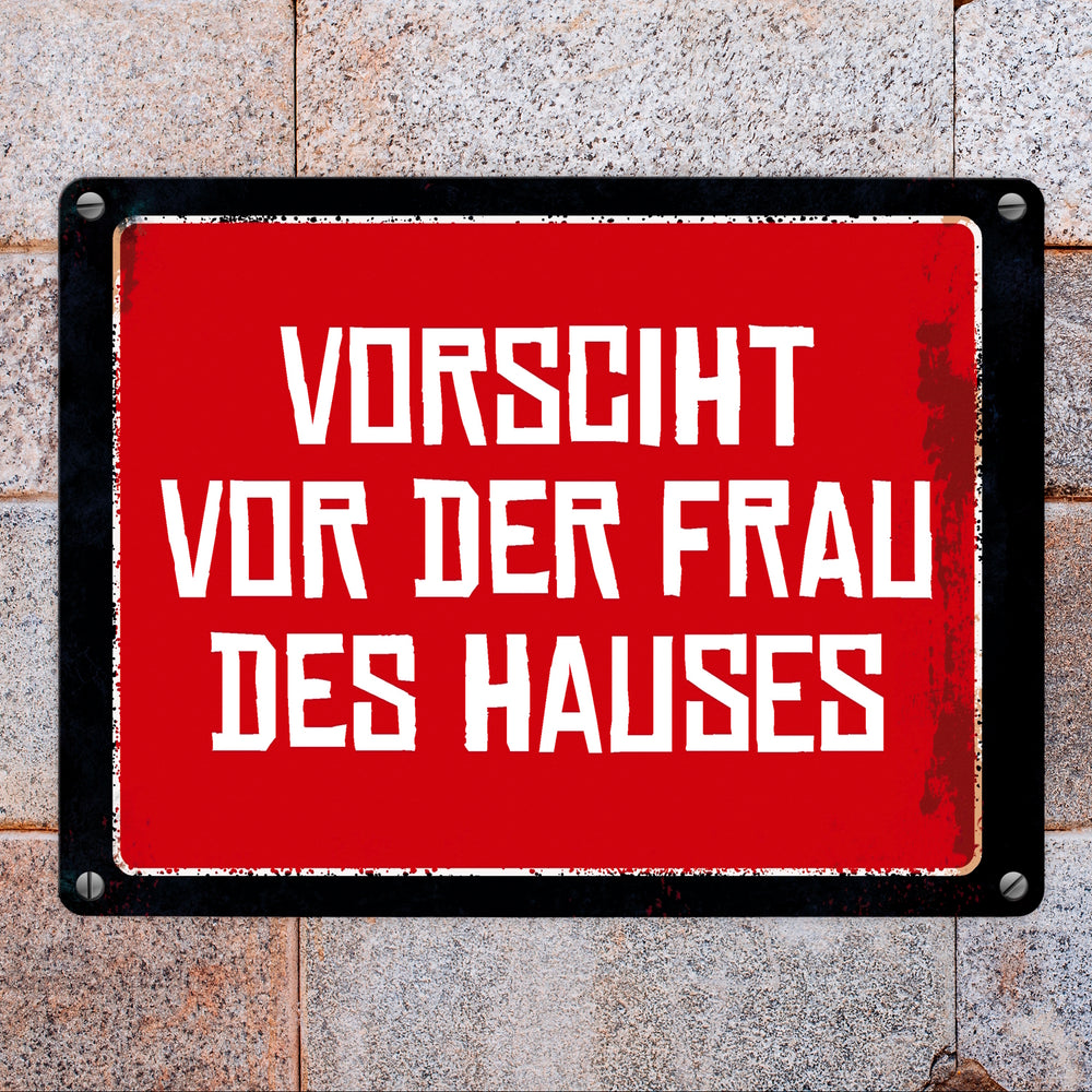 Vorsicht vor der Frau des Hauses Warn- und Hinweisschild im Used-Look