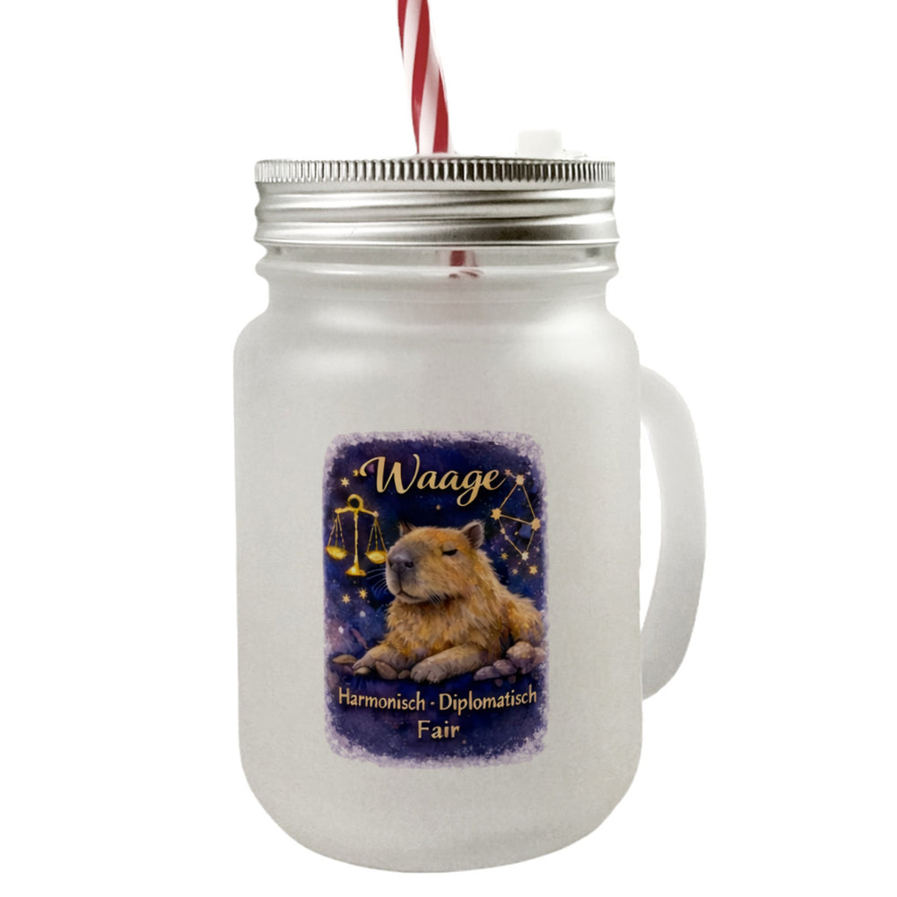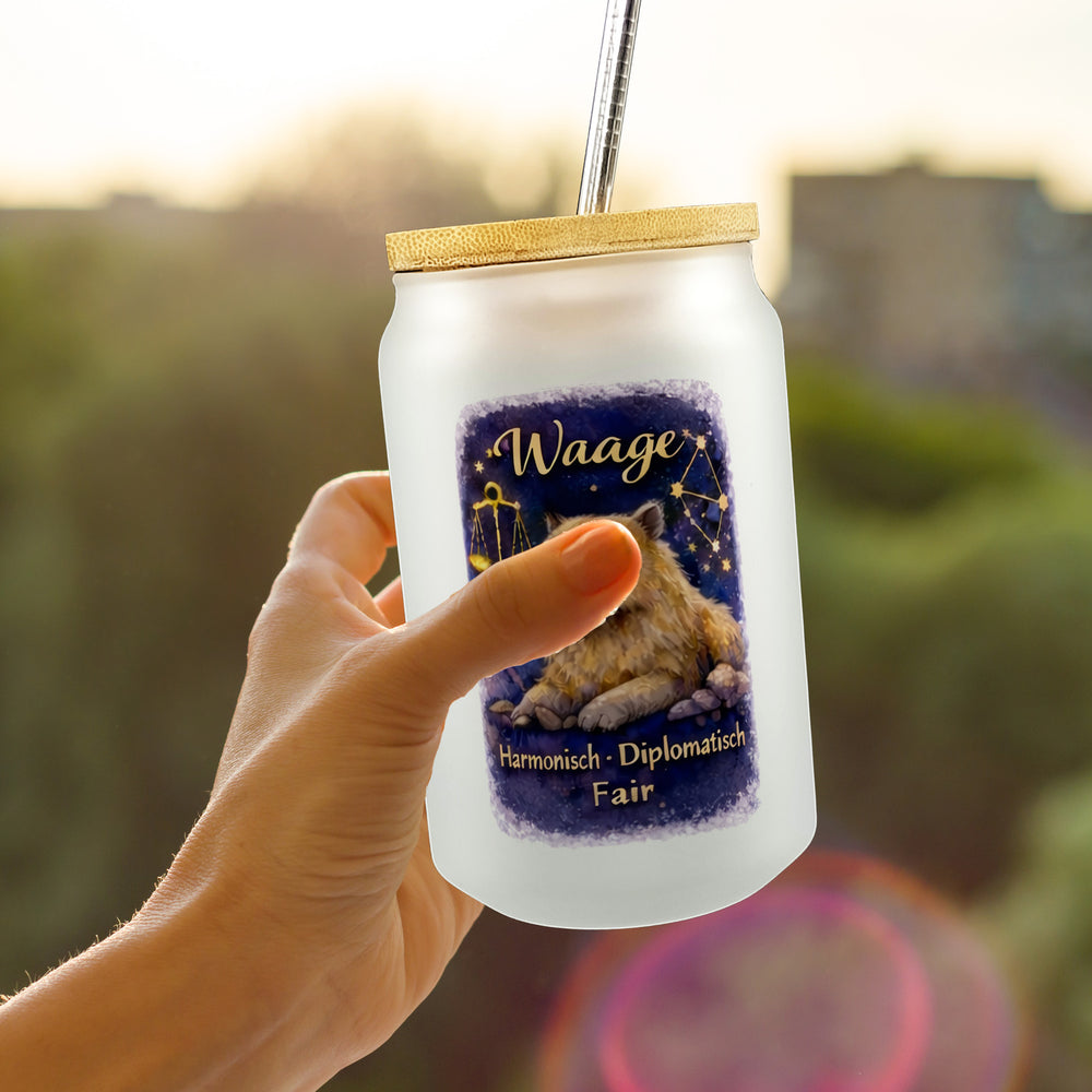 Waage Sternzeichen Cabybara Trinkglas mit Bambusdeckel für Astrologie Fans