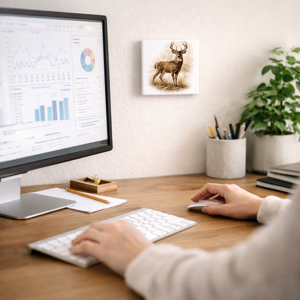 - Das Holzbild zeigt einen majestätischen Hirsch mit imposantem Geweih, eingerahmt von saftigem Gras. Der weiße Druck hebt das Naturmotiv hervor und fügt sich in jeden Raum ein. Ideal für Tier- und Naturliebhaber, wird es besonders durch seine künstlerische Darstellung geschätzt.