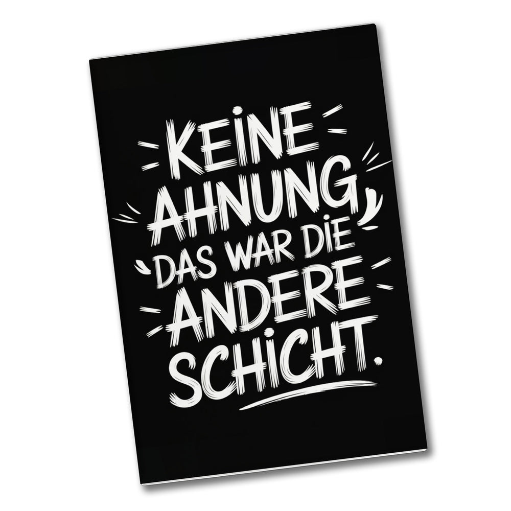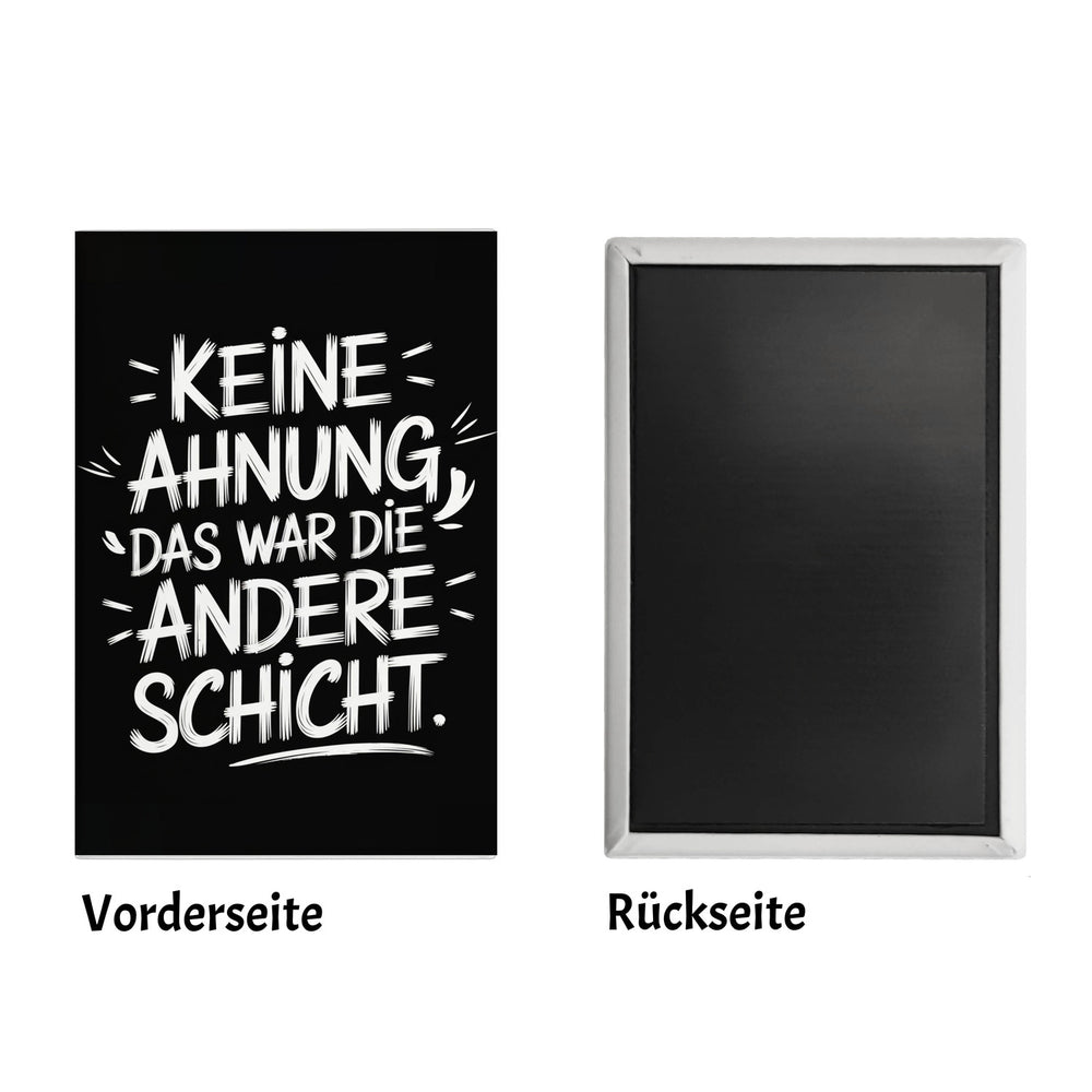 Der humorvolle Kühlschrankmagnet, gestaltet auf einem schlichten schwarzen Hintergrund, trägt den witzigen Spruch "KEINE AHNUNG DAS WAR DIE ANDERE SCHICHT" in verspielter, handschriftlicher Schrift. Eine Sprechblase wiederholt den gleichen Text, u Hinweise: Größe: ca. 8x5,5 cm