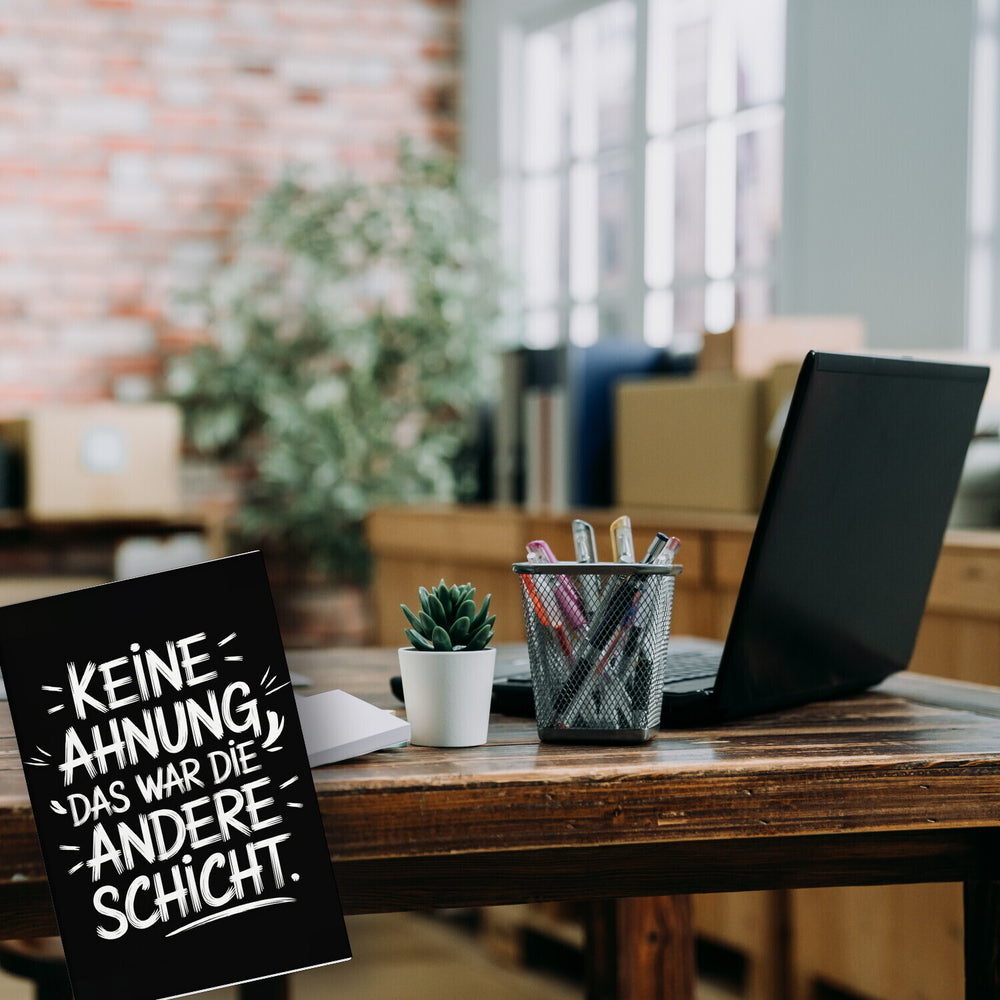 • Der humorvolle Kühlschrankmagnet, gestaltet auf einem schlichten schwarzen Hintergrund, trägt den witzigen Spruch "KEINE AHNUNG DAS WAR DIE ANDERE SCHICHT" in verspielter, handschriftlicher Schrift. Eine Sprechblase wiederholt den gleichen Text, um den Scherz doppelt zu betonen. Ein echter Hingucker für jede Magnetfläche!