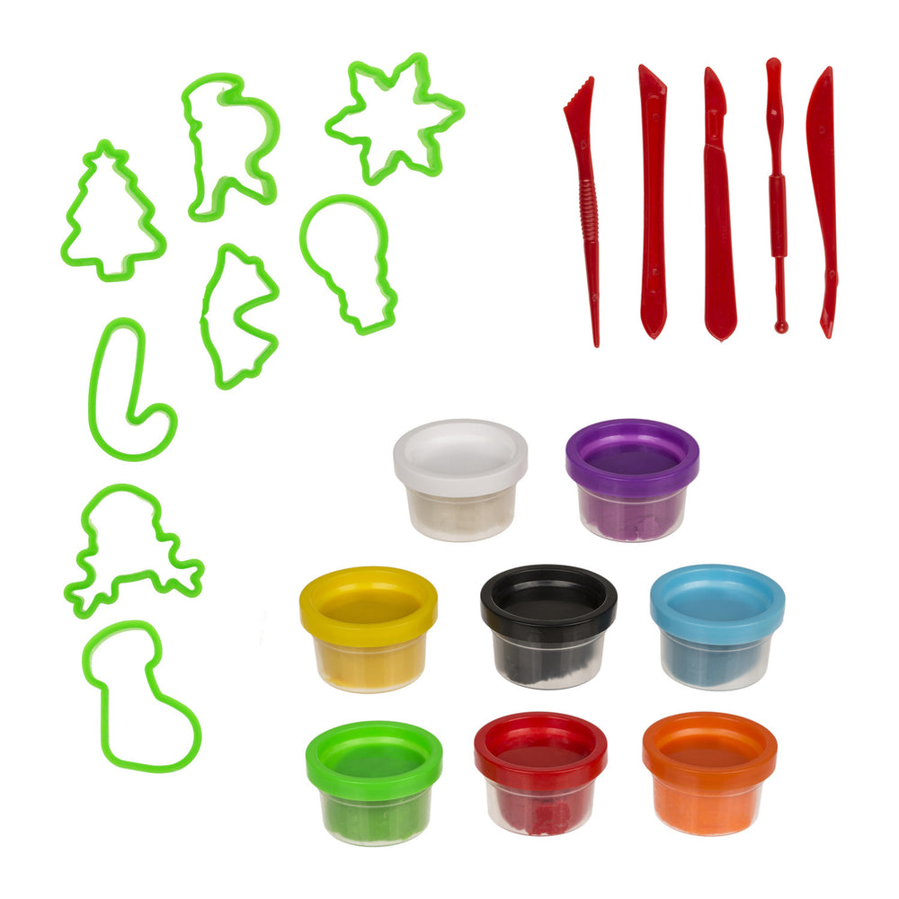 - 1x Weihnachts-Knet-Set - Spielknete mit Ausstechformen und Werkzeug im 21er-Set. Bestehend aus 8x bunte Knete, 8x Ausstechformen und 5x Werkzeug.