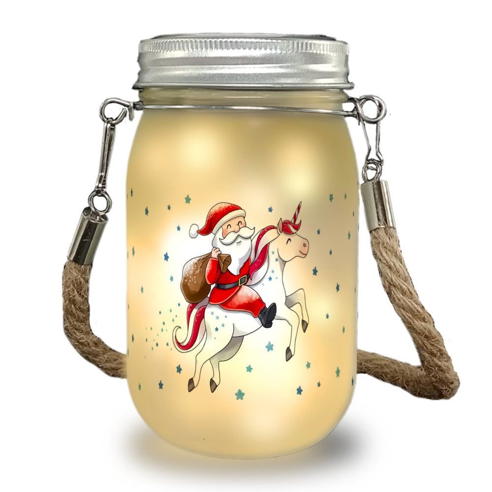 - Das lustige Solarlicht mit Weihnachtsmann Motiv ist ein echter Hingucker! Der Weihnachtsmann reitet auf einem magischen Einhorn, umgeben von leuchtenden Sternen. Dieses Dekolicht ist in einem nostalgischen Einmachglas mit Solar-Deckel und Henkel aus Strick untergebracht. Perfekt für die weihnachtliche Dekoration im Kinderzimmer!