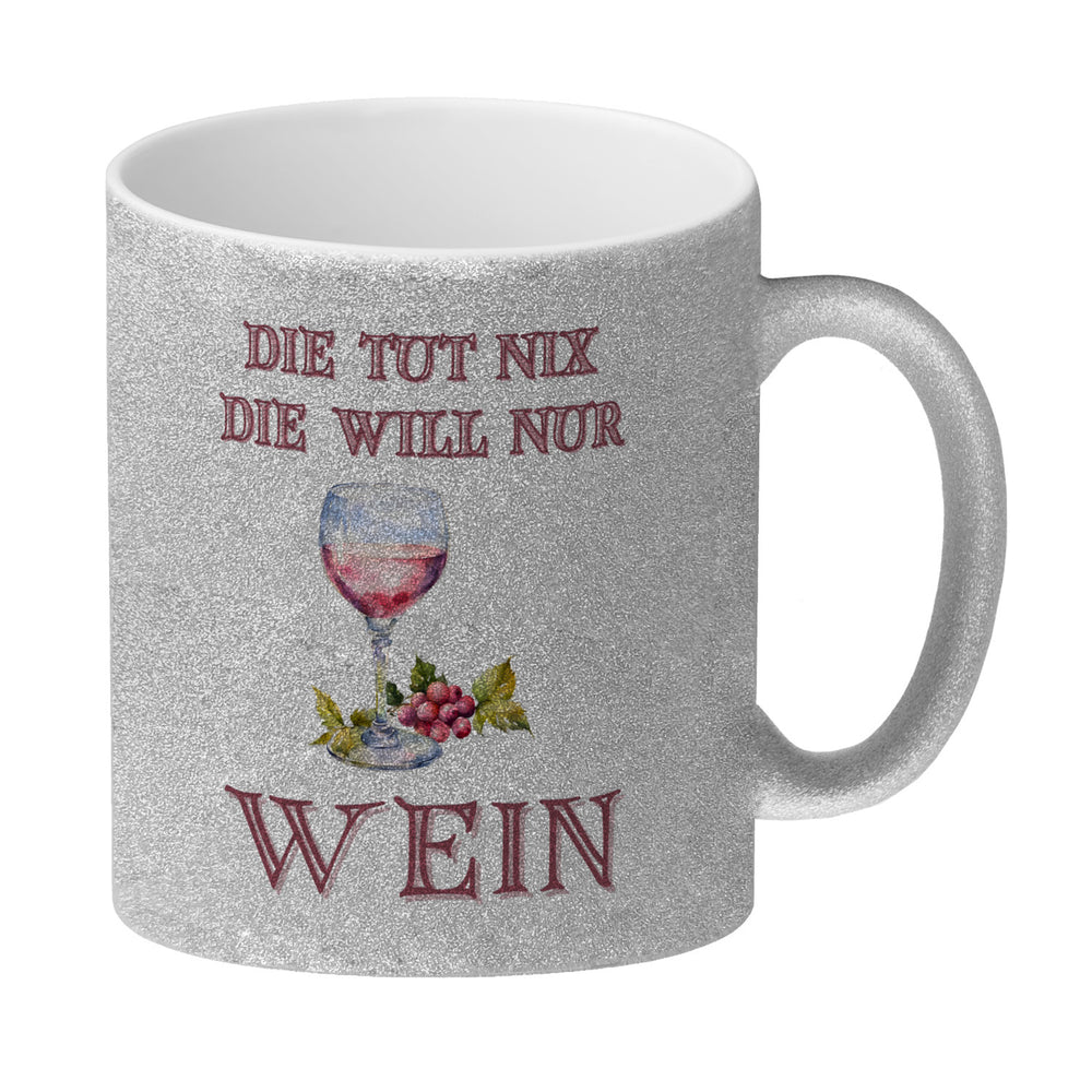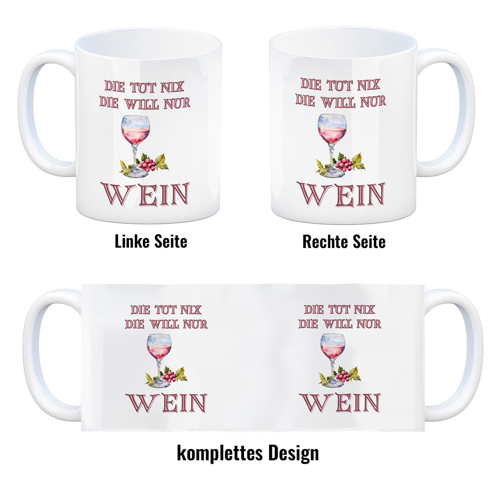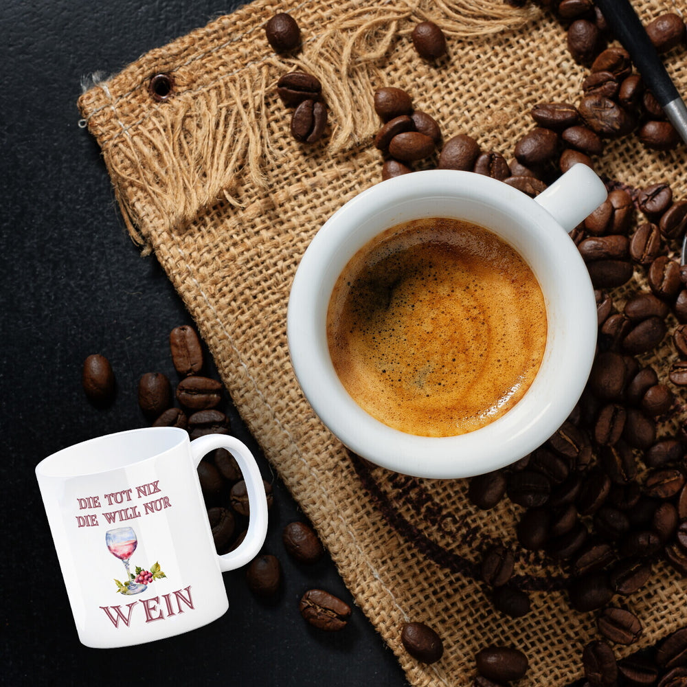 Wein Kaffeebecher mit Spruch Die tut nix die will nur Wein - Weiß ist auf Lager und wird versandt, sobald es wieder verfügbar ist