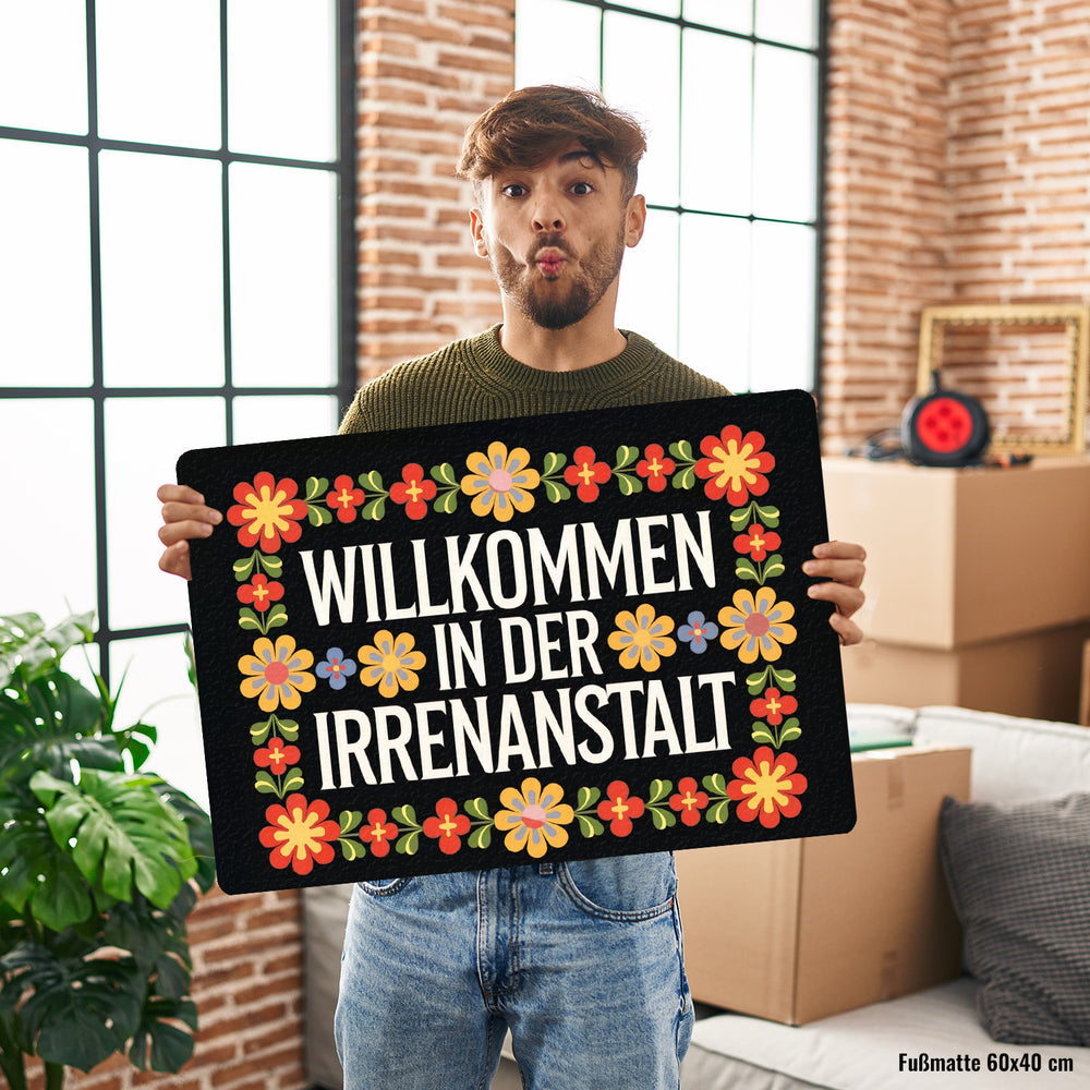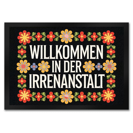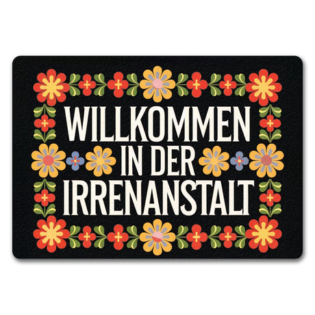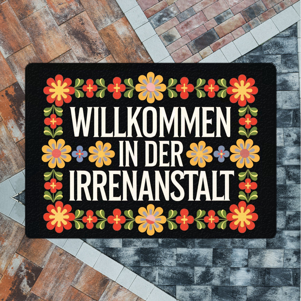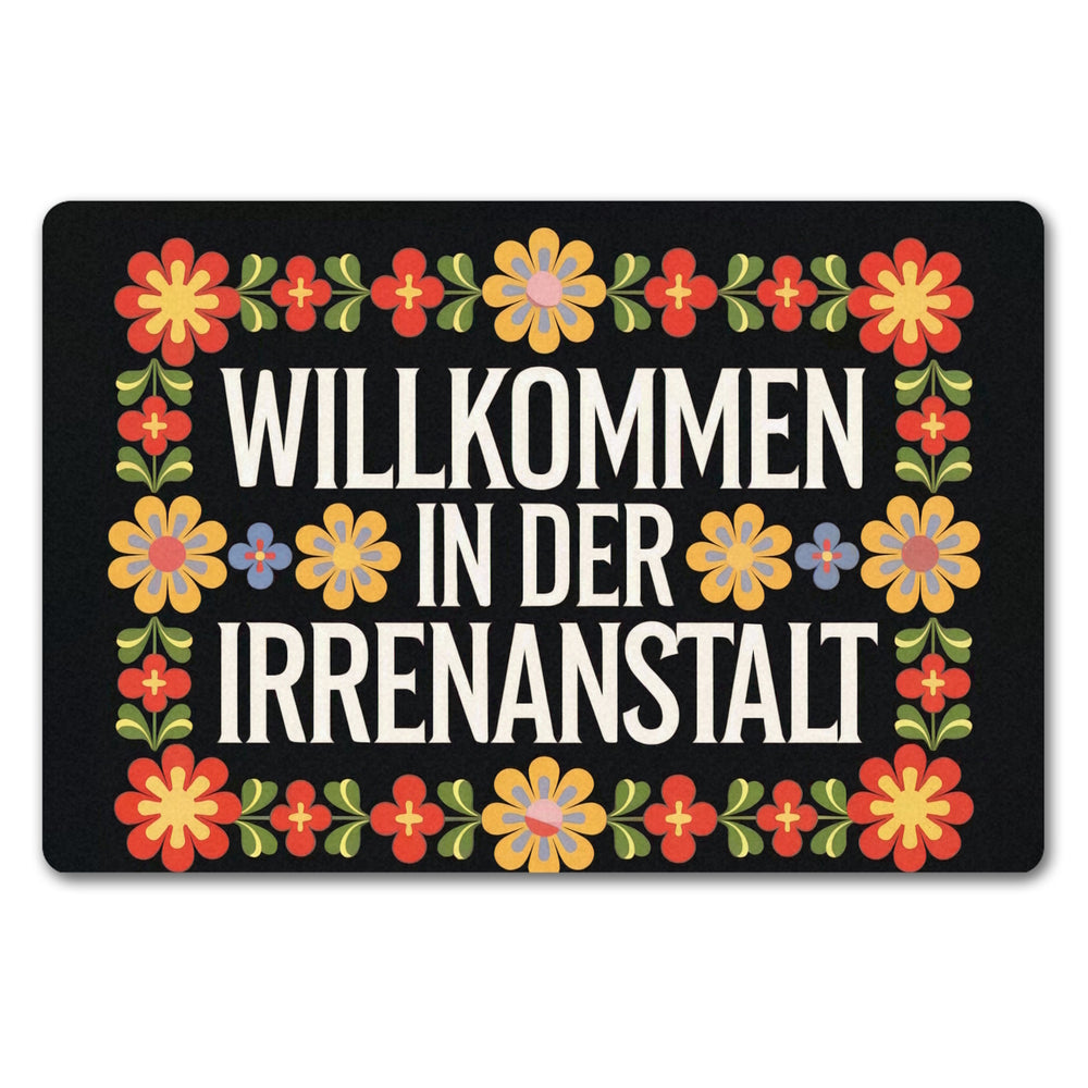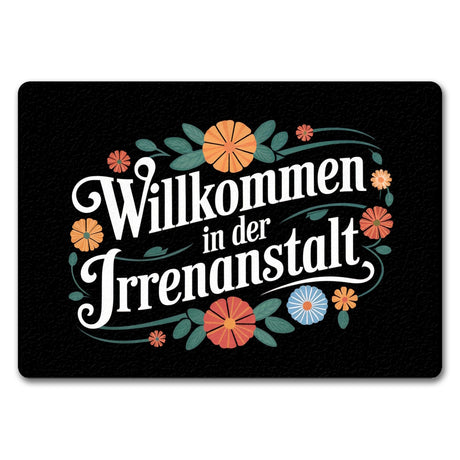 - Willkommen in der Irrenanstalt! Unsere Fußmatte begrüßt dich und deine Gäste mit einem Augenzwinkern. Sie kombiniert schwarzen Hintergrund und dekorative Schriftart mit wilden, retro-bunten Blumenornamenten. Perfekt für alle, die Humor lieben und ihren Eingangsbereich aufpeppen wollen!
