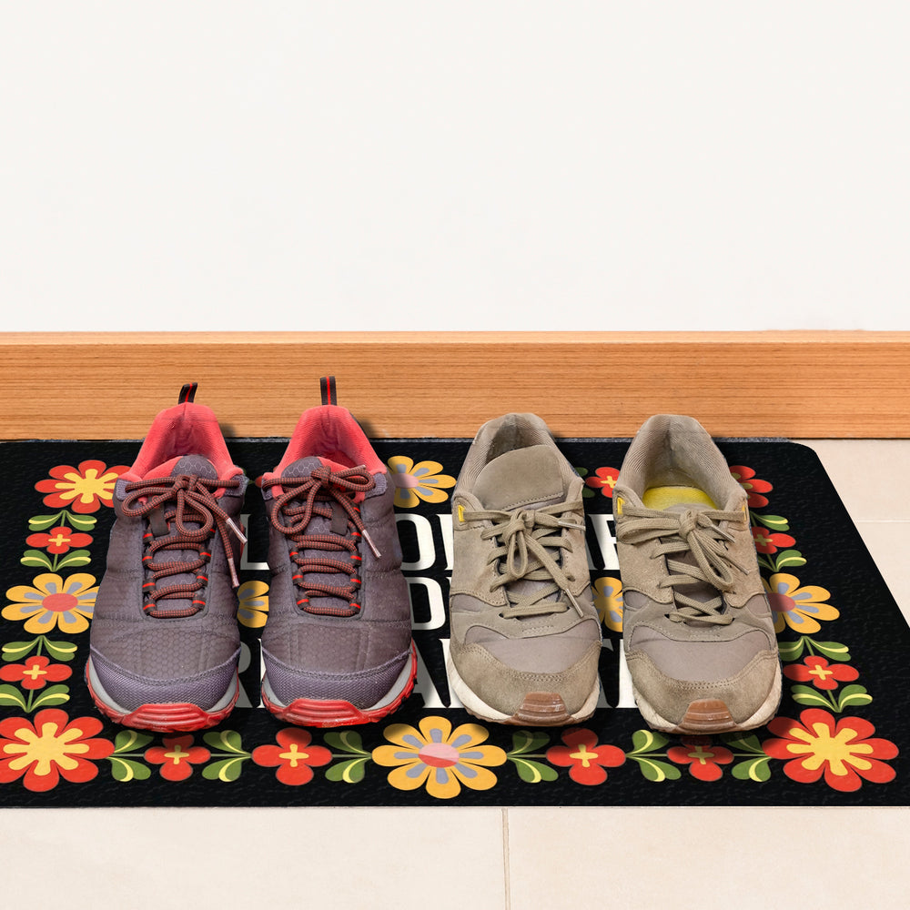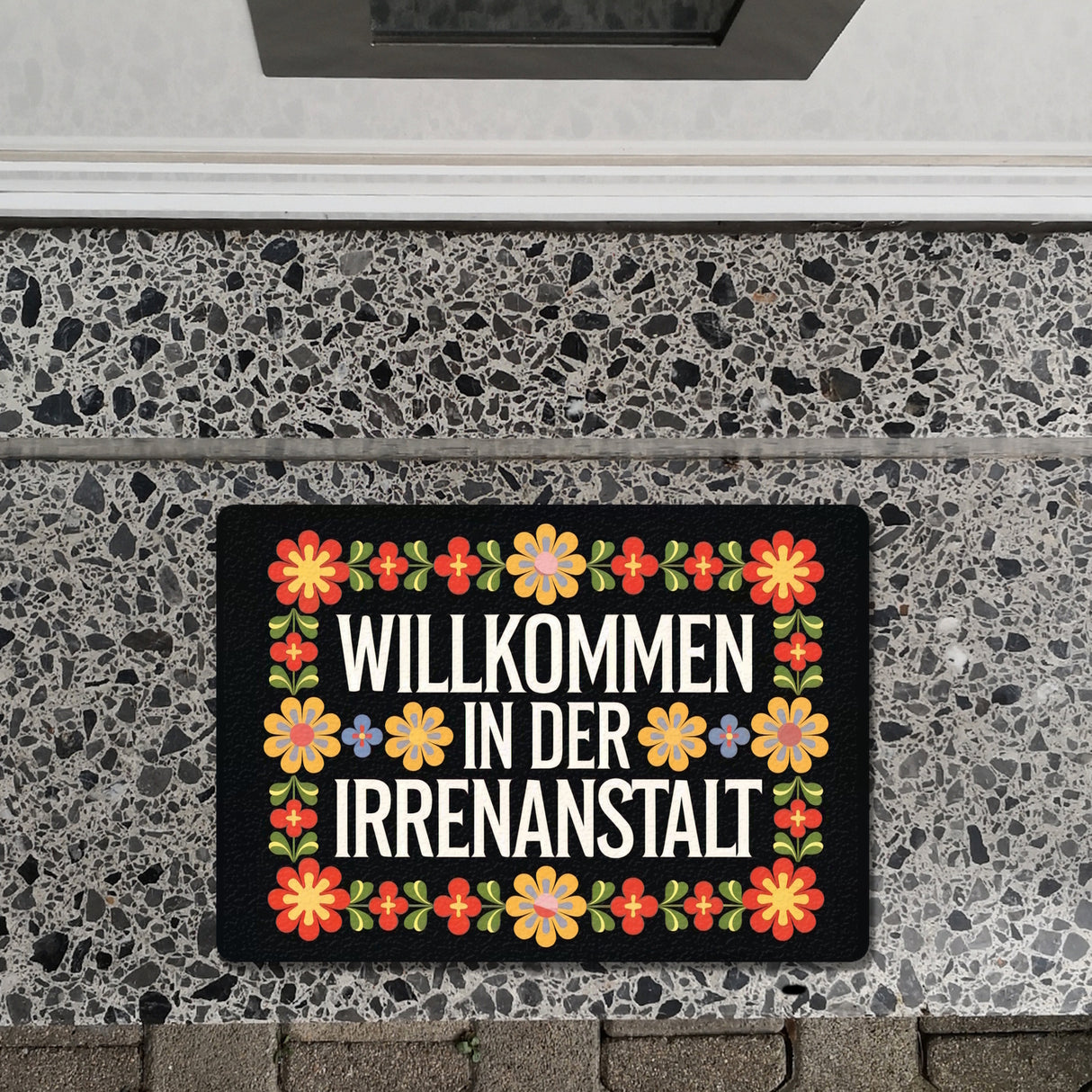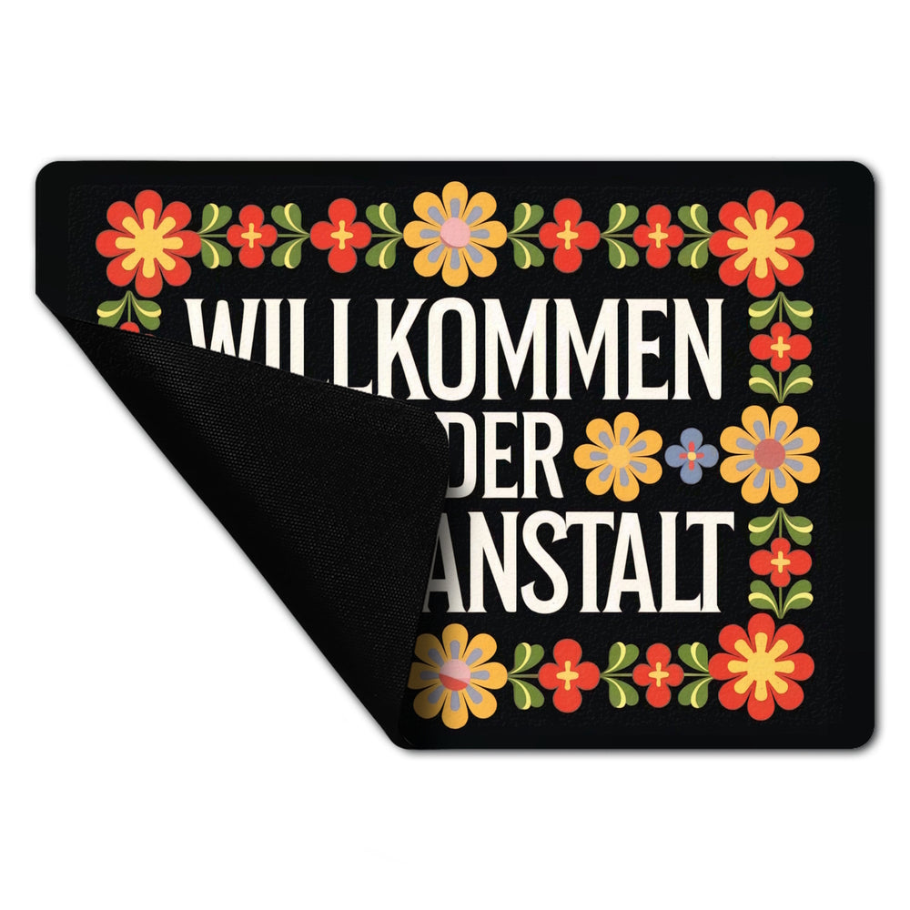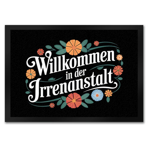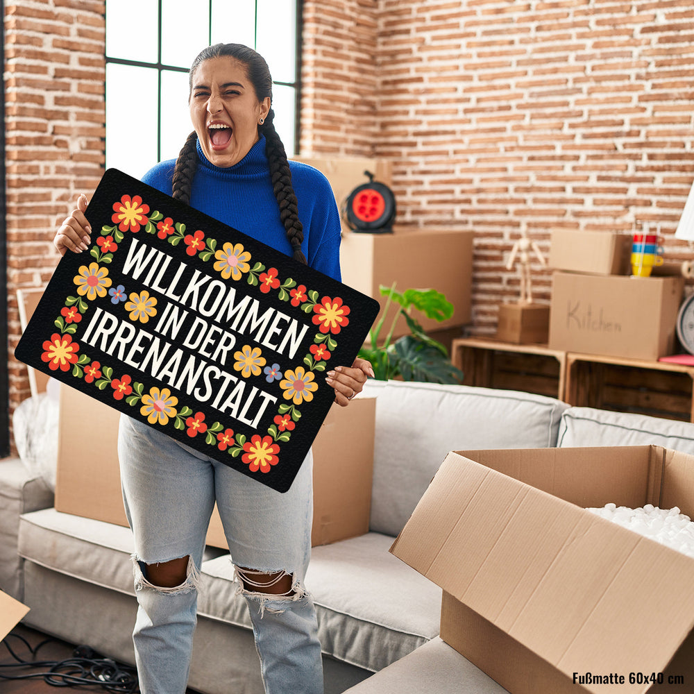 - Willkommen in der Irrenanstalt! Unsere Fußmatte begrüßt dich und deine Gäste mit einem Augenzwinkern. Sie kombiniert schwarzen Hintergrund und dekorative Schriftart mit wilden, retro-bunten Blumenornamenten. Perfekt für alle, die Humor lieben und ihren Eingangsbereich aufpeppen wollen!