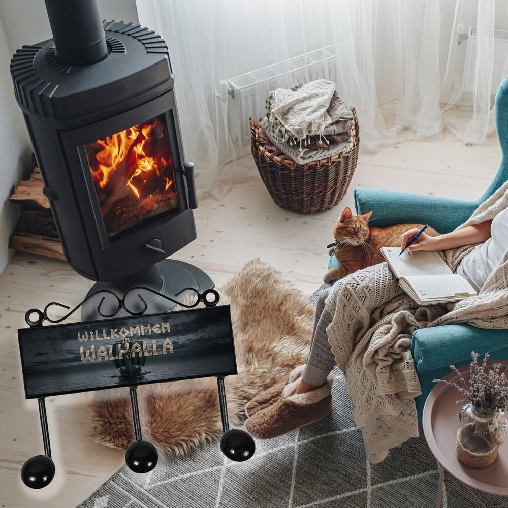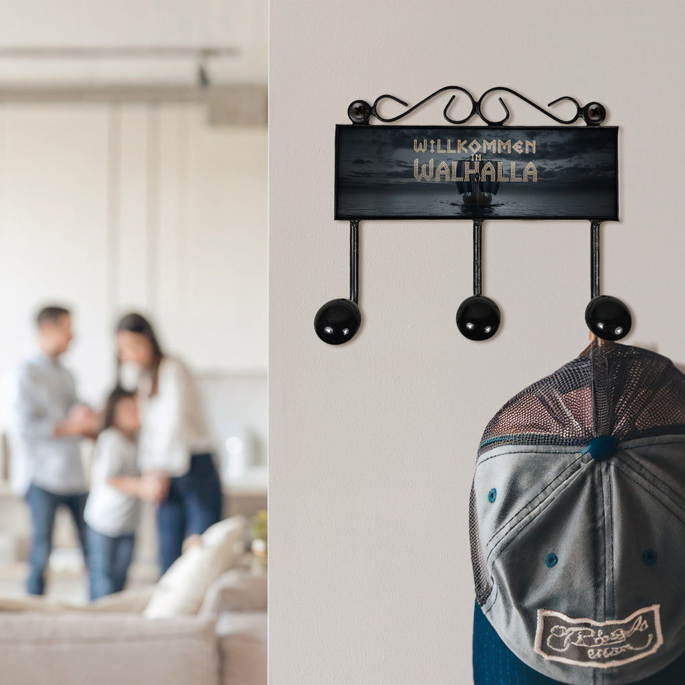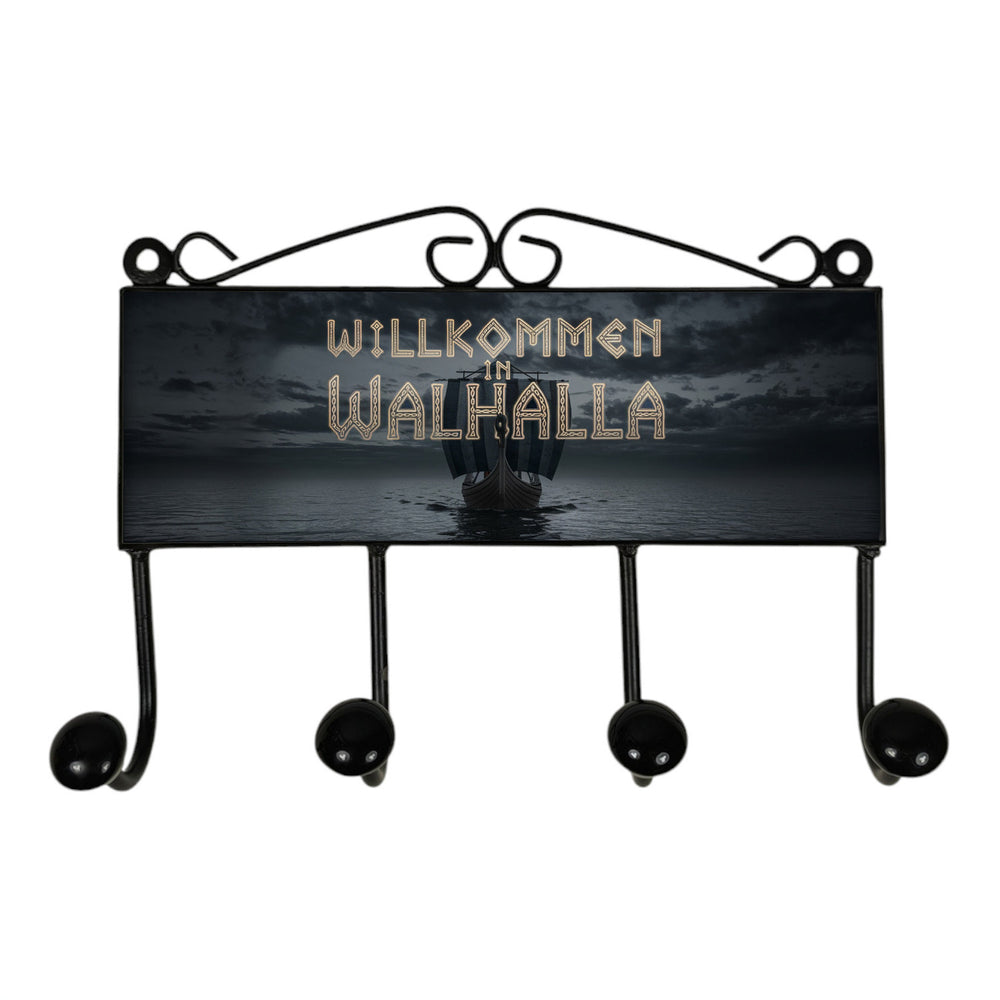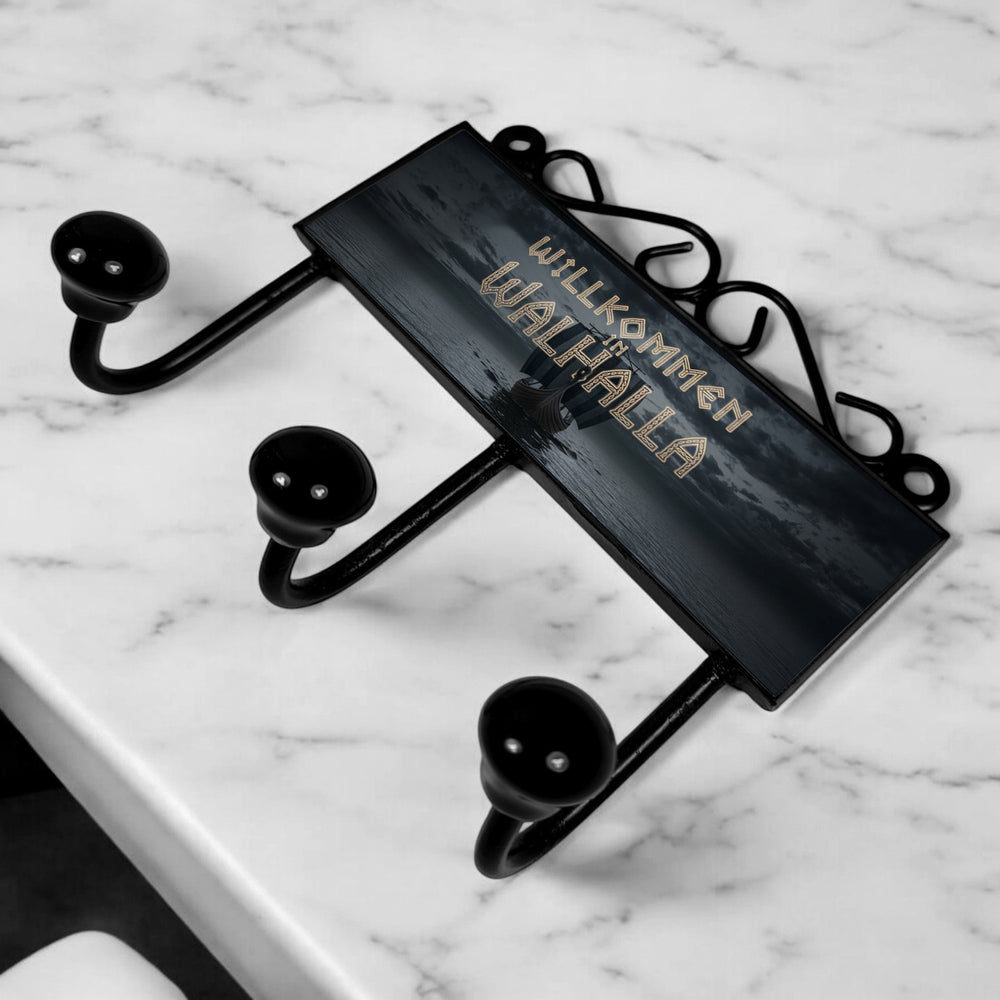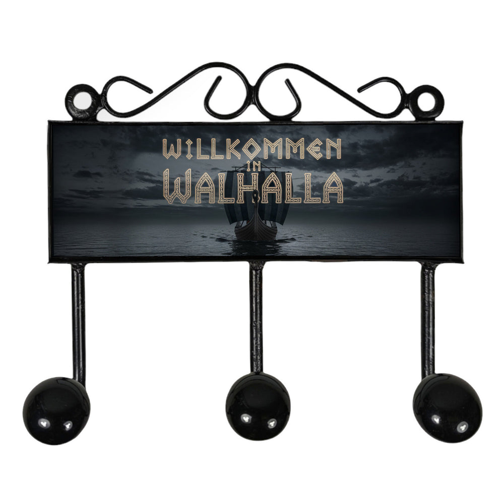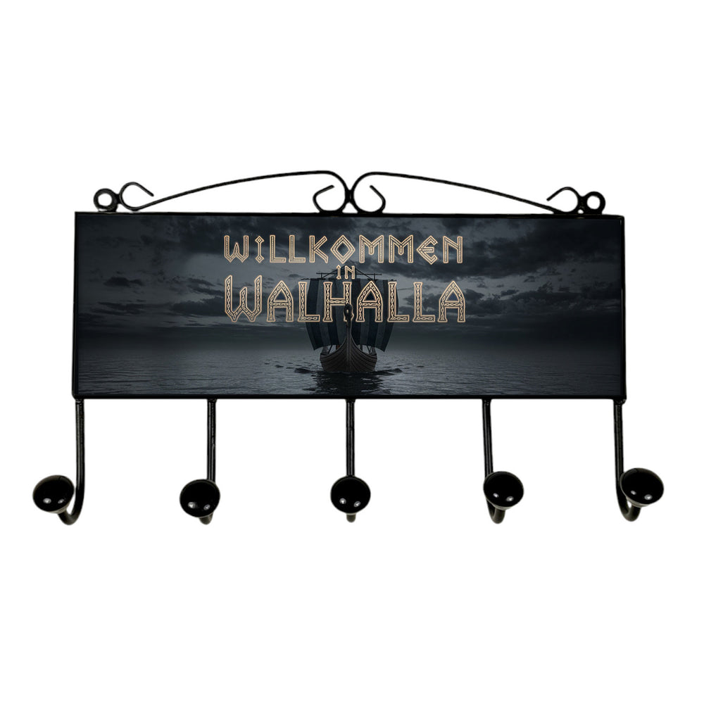 - Diese Kleiderhakenleiste zeigt ein robustes Wikingerschiff, das majestätisch über ruhige Gewässer gleitet. Der Himmel ist dramatisch wolkenverhangen, und in leuchtenden Runen heißt es: "Willkommen in Walhalla". Ein echtes Kunstwerk mit nordischem Flair, perfekt für Abenteurer.