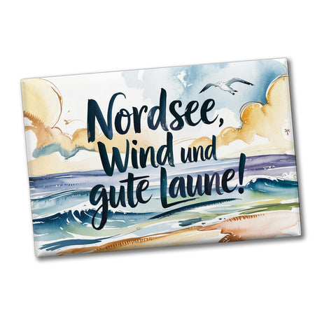 - Dieser lustige Kühlschrankmagnet zeigt eine entspannte Nordseelandschaft im Aquarellstil. Mit dem Spruch "Nordsee, Wind und gute Laune!" bringt er ein Lächeln in jede Küche. Die sanften Blau-, Grau- und Sandbeigetöne, durchbrochen von weißen Meerschaumakzenten und einer eleganten Möwe, versprühen maritime Gelassenheit.