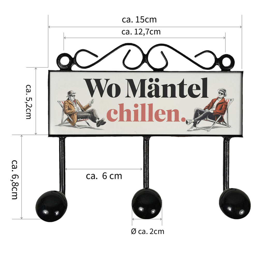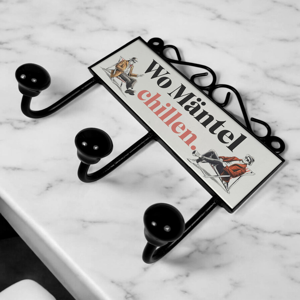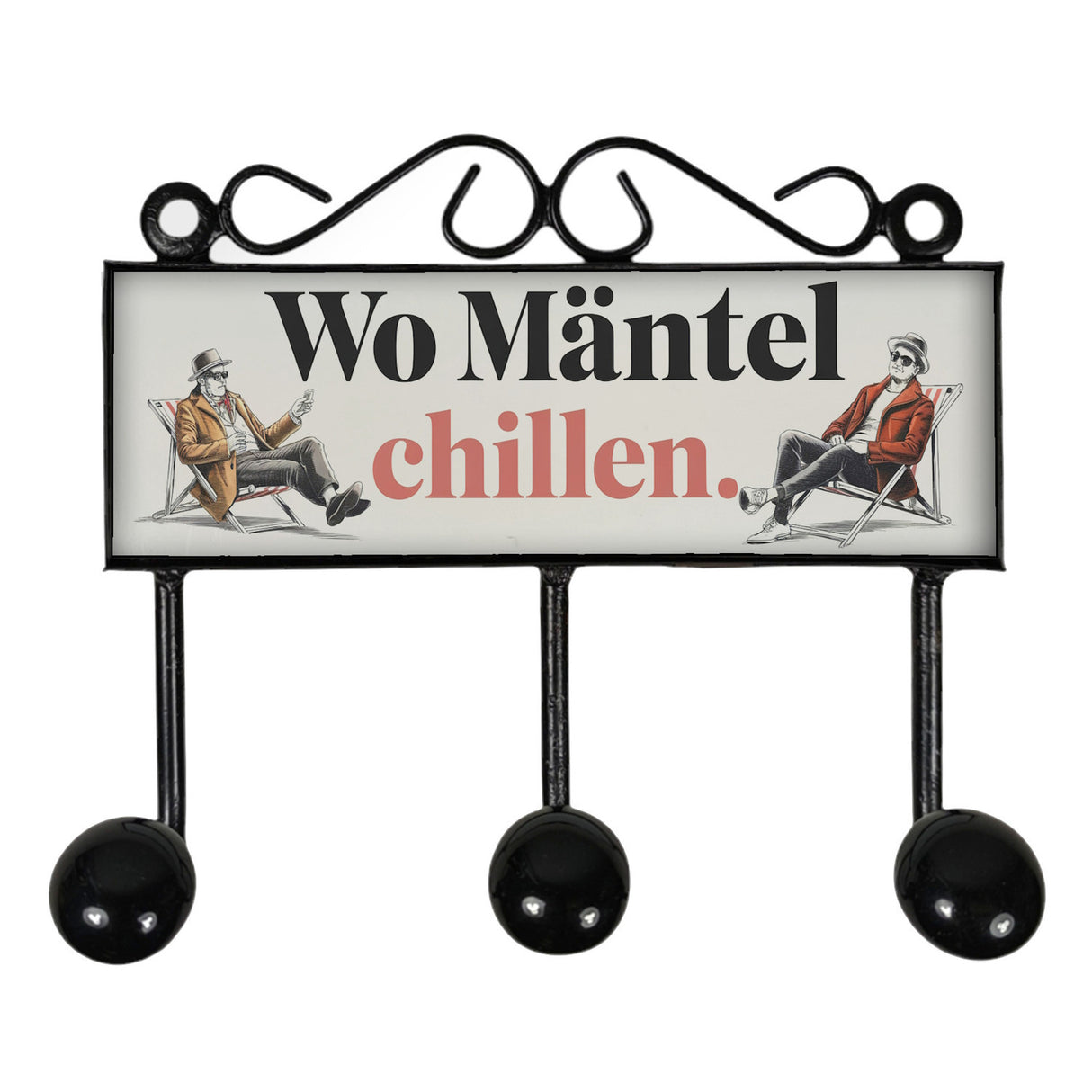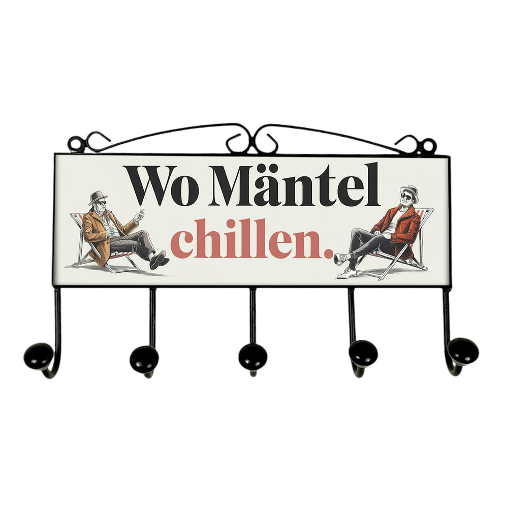 - Der humorvolle Kleiderhaken Wo Mäntel chillen ist ein echter Hingucker! Das 3er-Set überzeugt mit einem retro-inspirierten Design auf weißem Hintergrund. Zwei Männer entspannen auf Strandstühlen, während der freche Spruch in fetten Buchstaben darüber prangt. Perfekt für jeden, der Stil mit einem Augenzwinkern schätzt!