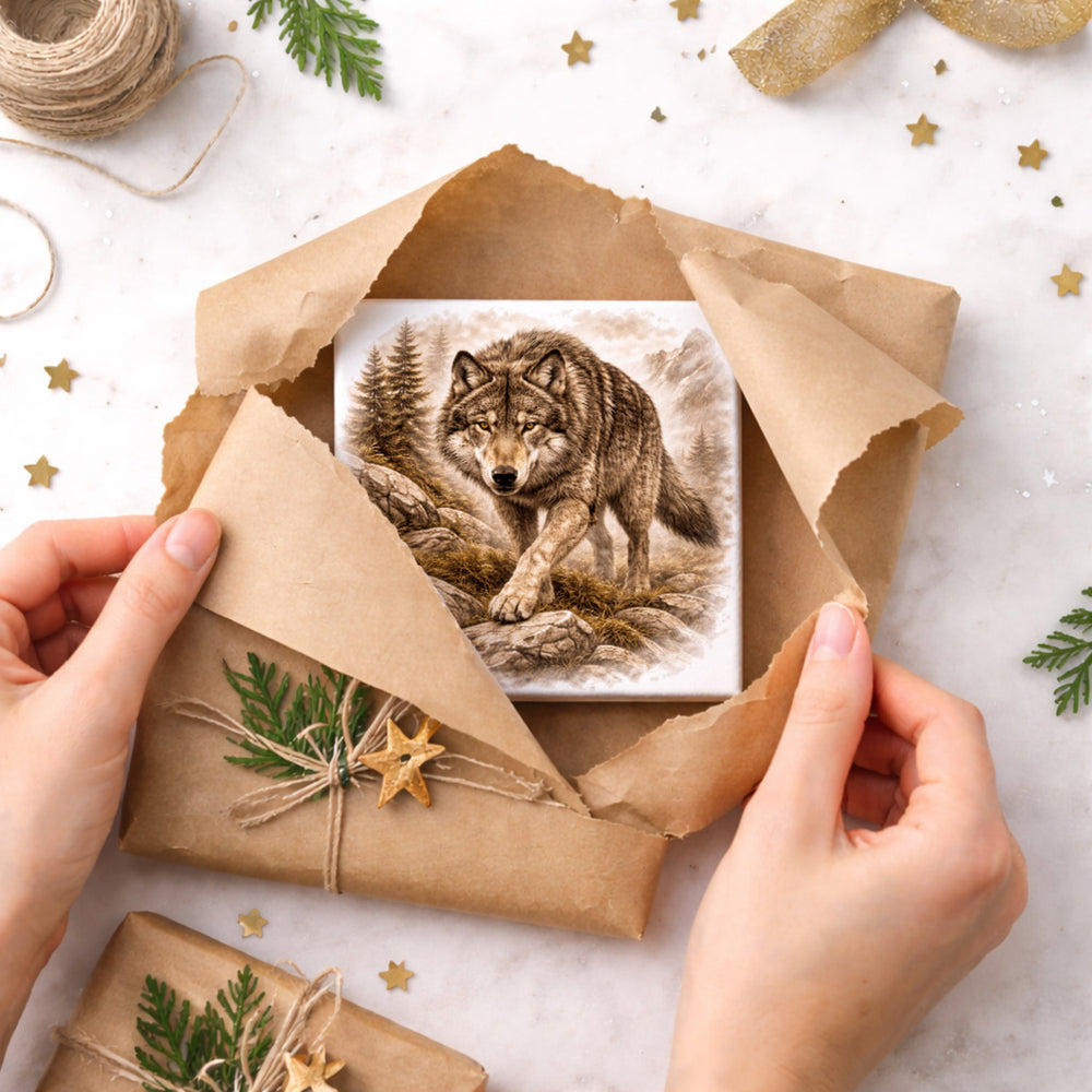 Wolfsmagie Wolf in Bergen Holzbild in 10x10 cm zum Stellen oder Aufhängen - 37-41 ist auf Lager und wird versandt, sobald es wieder verfügbar ist