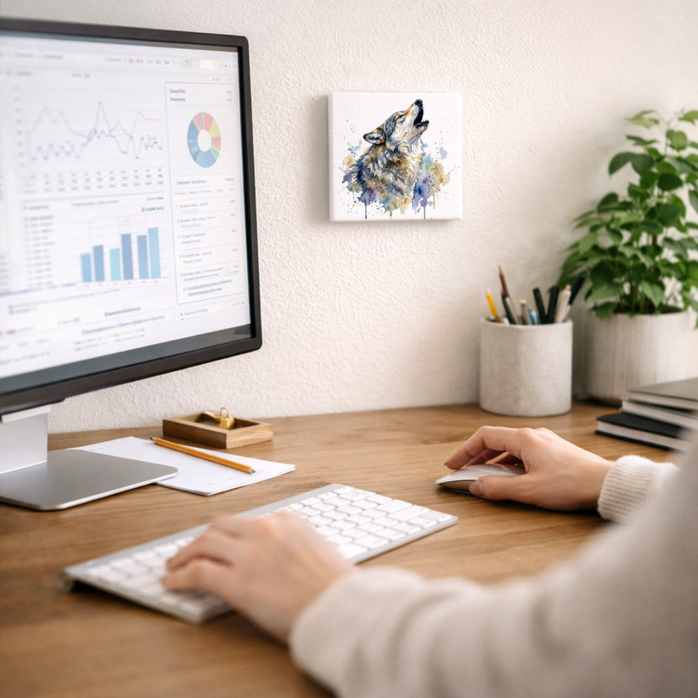 - Dieses einzigartige Holzbild zeigt einen majestätischen Wolf, der in einem bunten Aquarellstil heult. Die Farbspritzer und Tropfen verleihen dem Bild eine lebendige und dynamische Optik. Der weiße Hintergrund hebt das Motiv hervor und macht es zu einem auffälligen Kunstwerk für jede Wand.