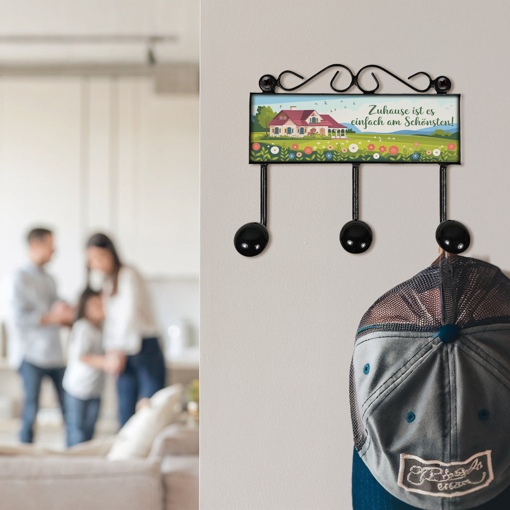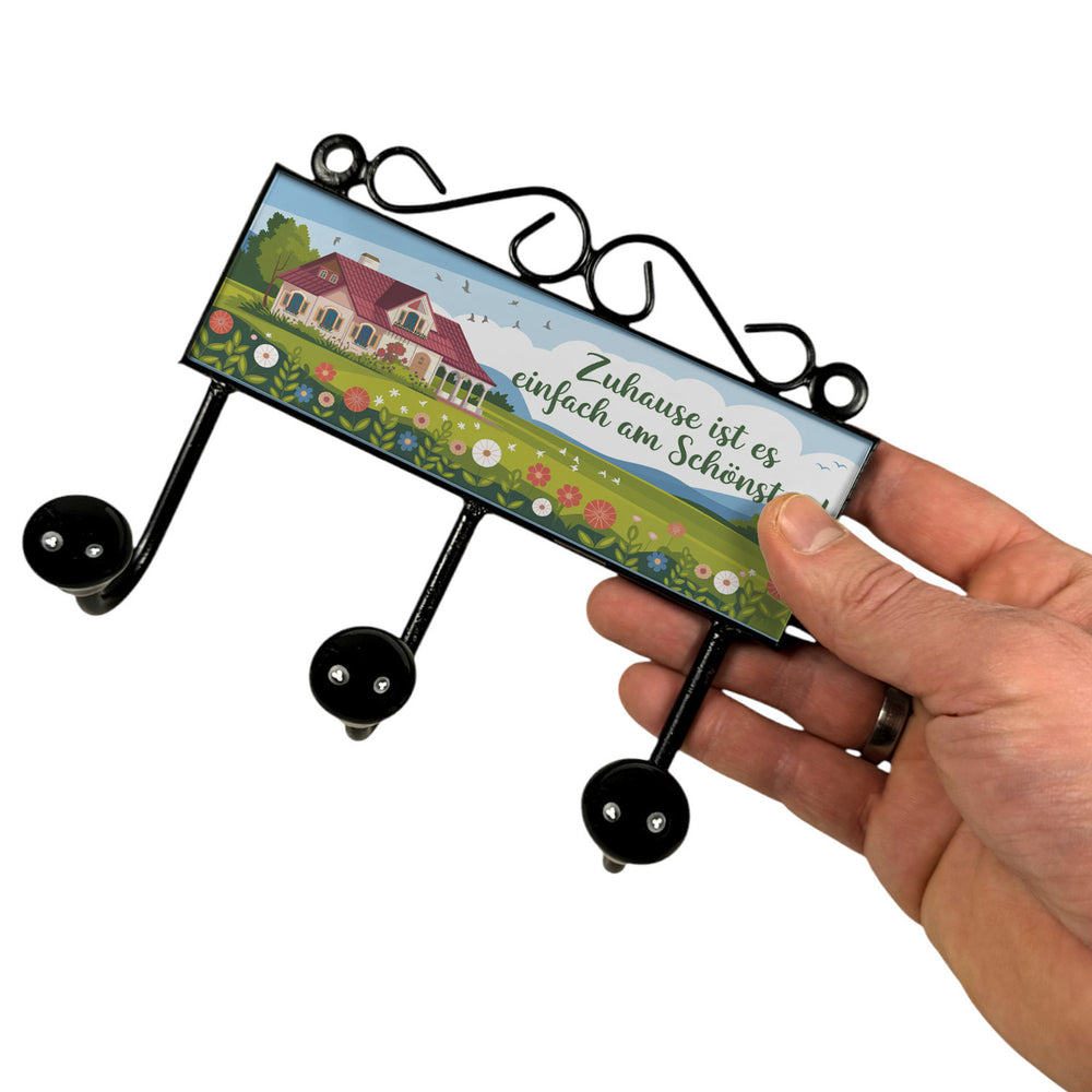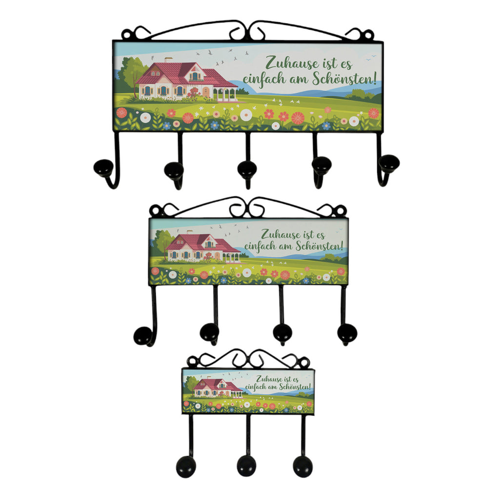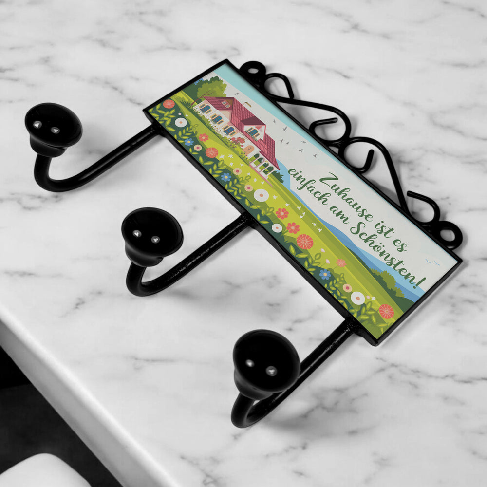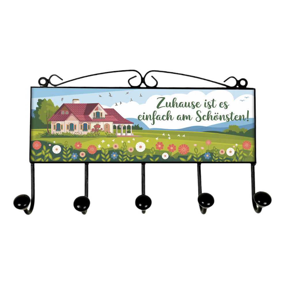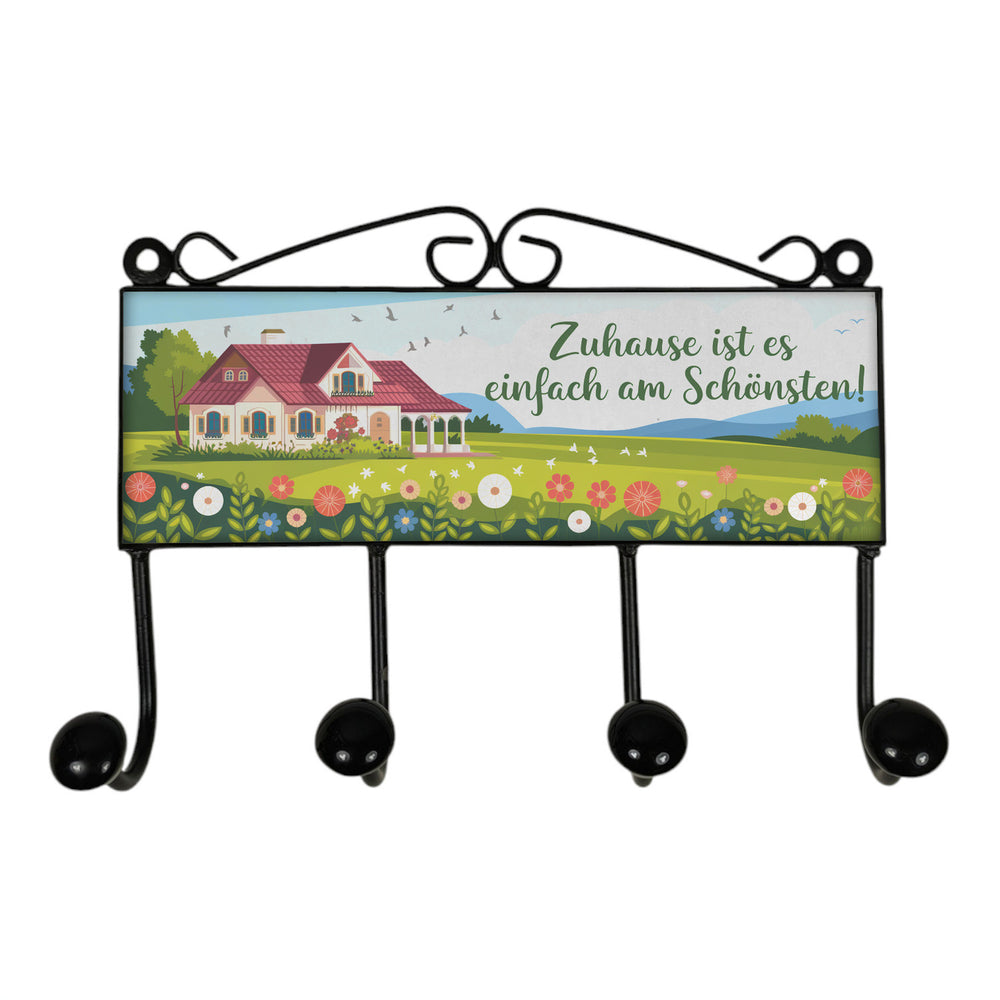 - Die Kleiderhakenleiste bezaubert mit einem idyllischen Haus auf einem grünen Feld, umrahmt von bunten Blumen und fröhlichen Vögeln. Das rote Dach, die weißen Wände und der blaue Himmel versprühen Landidyll pur. Der Spruch "Zuhause ist es einfach am Schönsten!" vermittelt Wärme und Geborgenheit.